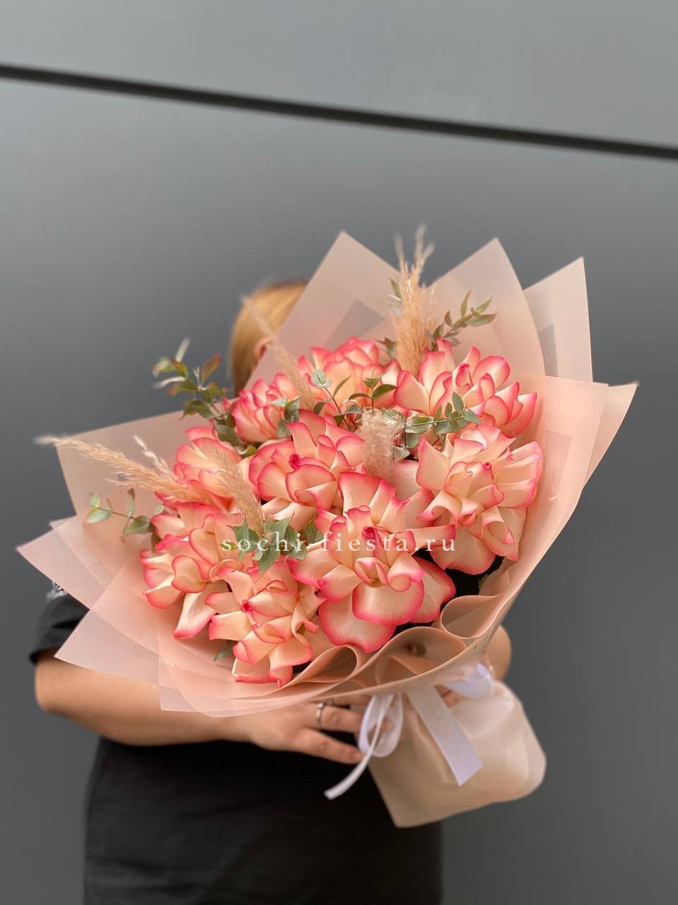 Одиннадцать французских роз выстроены в округлую композицию с веточками эвкалипта. Бутоны крупные и плотные, держат форму и наполняют пространство свежим присутствием.