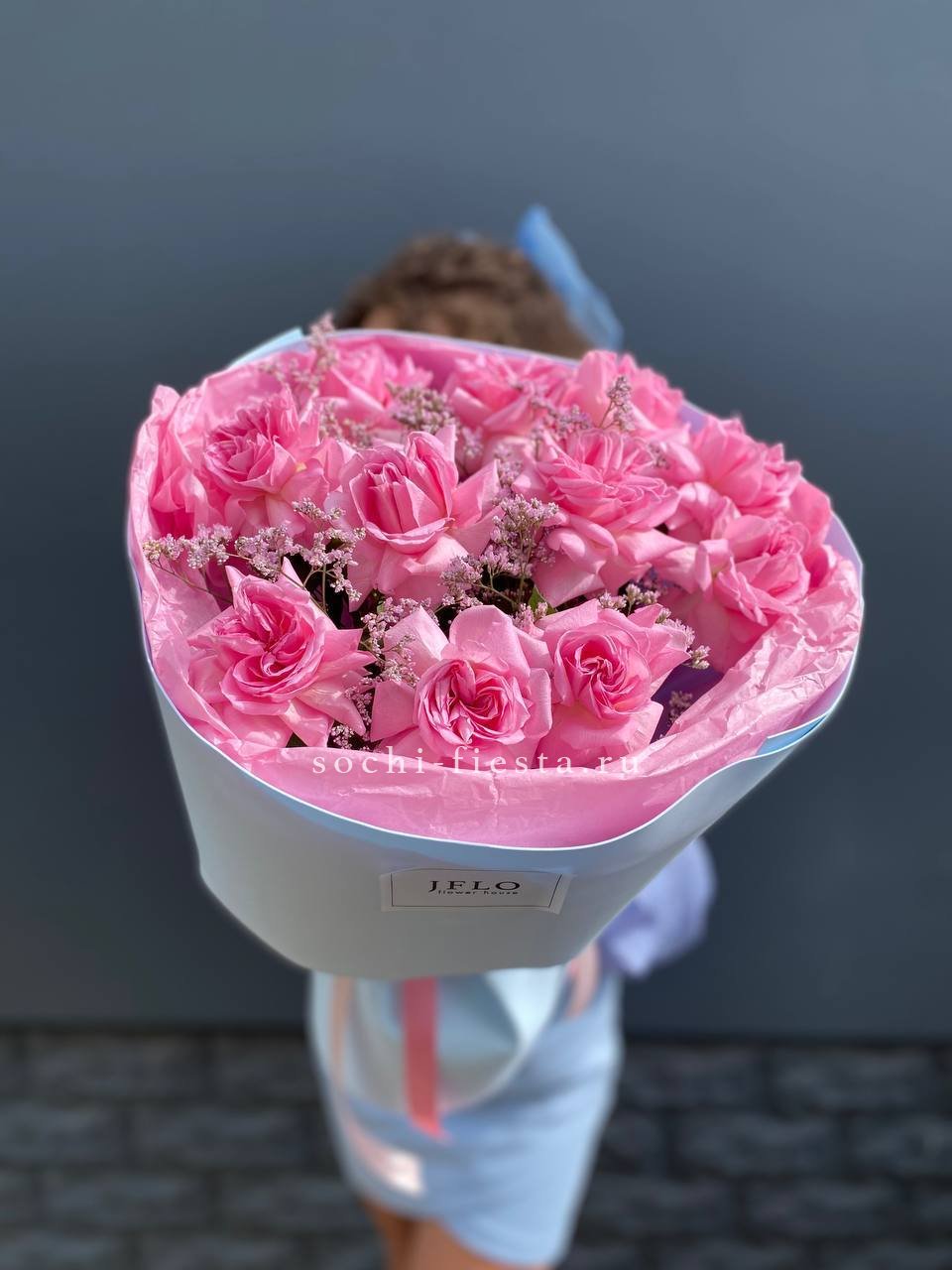 французские розовые розы., лимониум, эвкалипт, лента, дизайнерская пленка. На фото представлен букет из 11 роз.