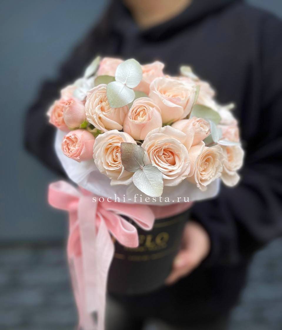 Пятнадцать белых роз собраны в компактный бокс с ветками эвкалипта. Чистая форма и спокойная гамма создают ощущение воздуха и света в любом пространстве.