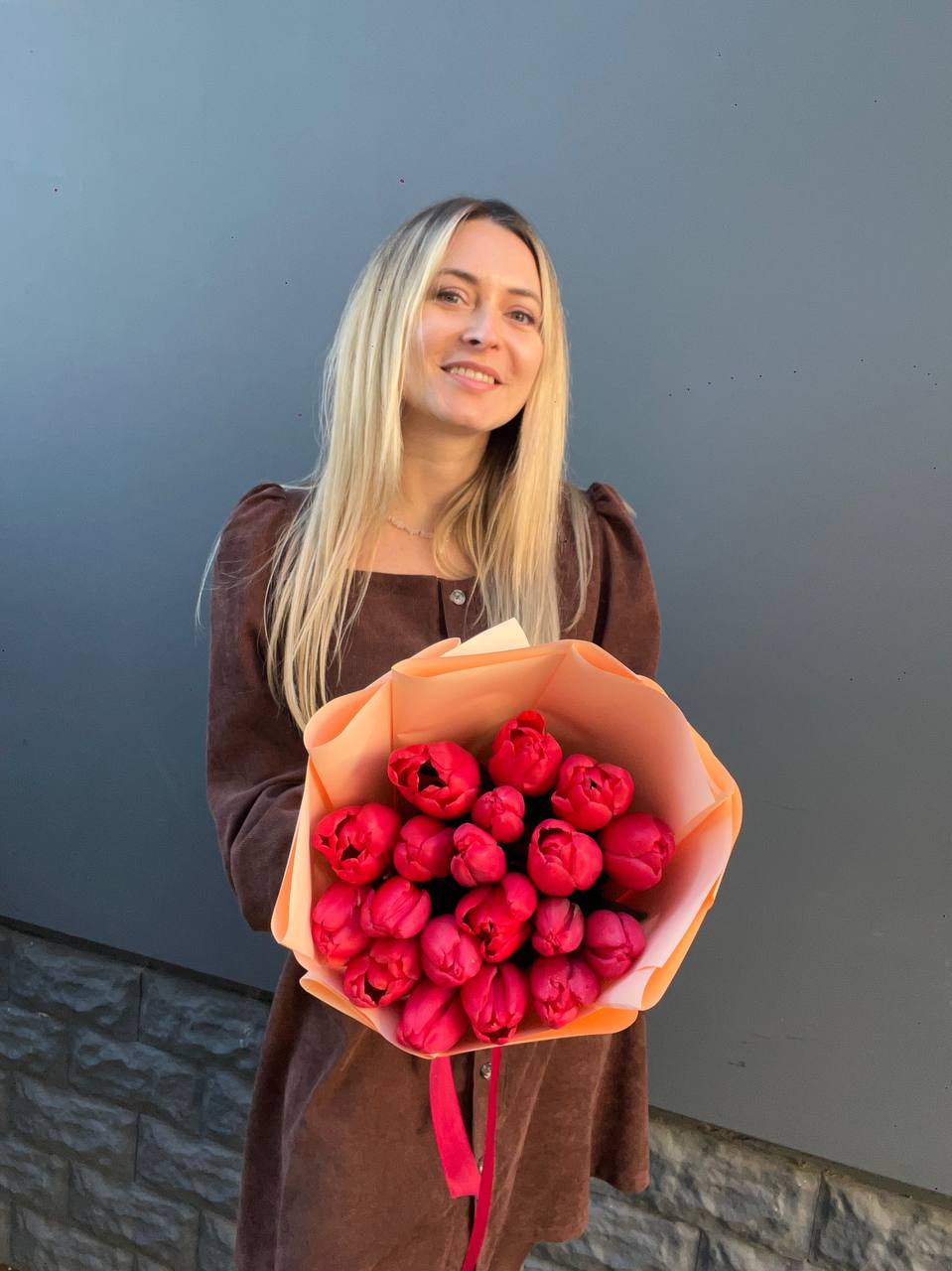 Девятнадцать бутонов собраны в плотную охапку, где каждый стебель держит свою линию. Красный оттенок звучит чисто и открыто, без лишних деталей. Букет готов говорить сам за себя.