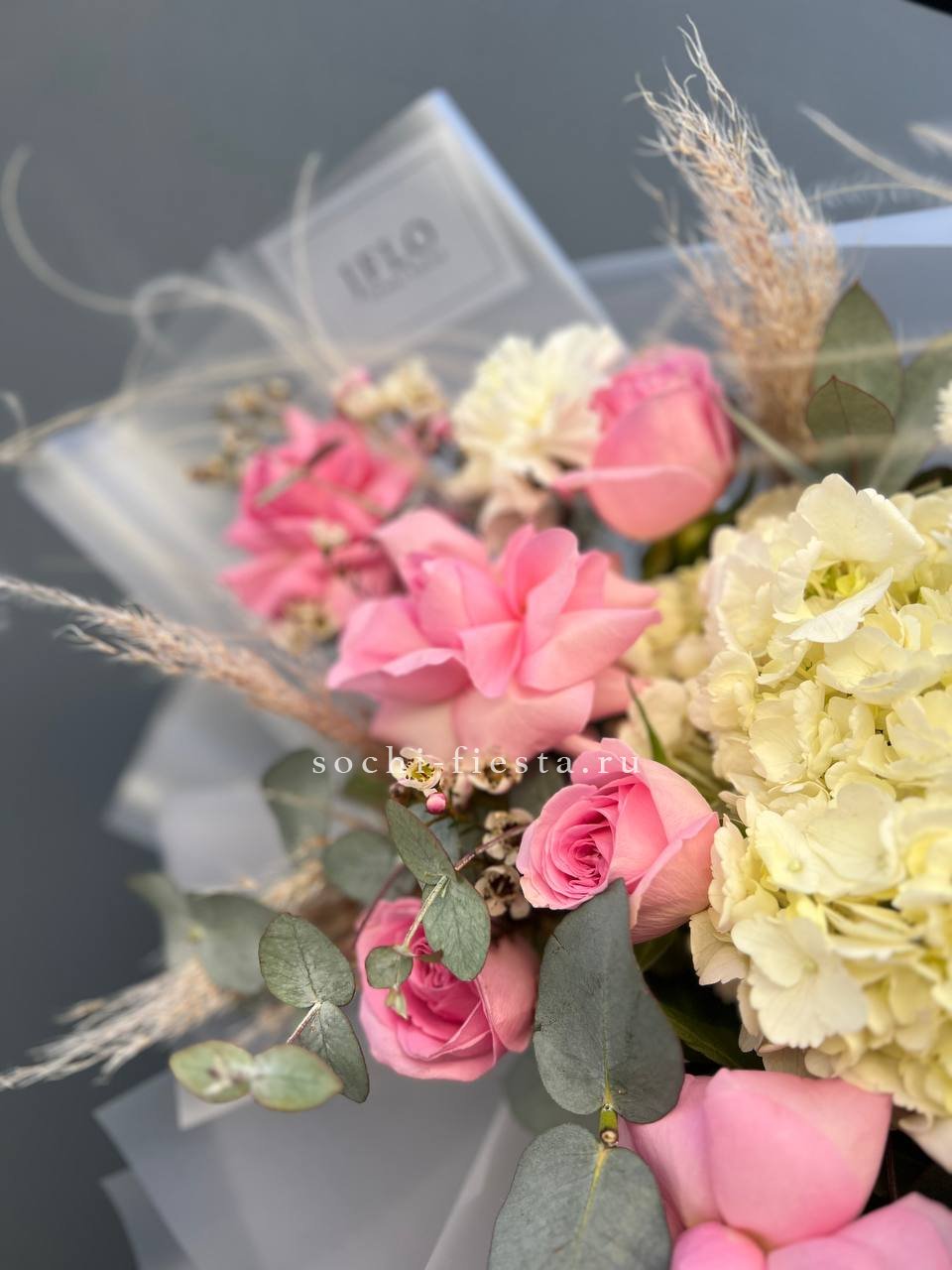 диантусы, розовые розы, гортензия, эвкалипт, вспомогательные цветы, лента, корейская пленка.