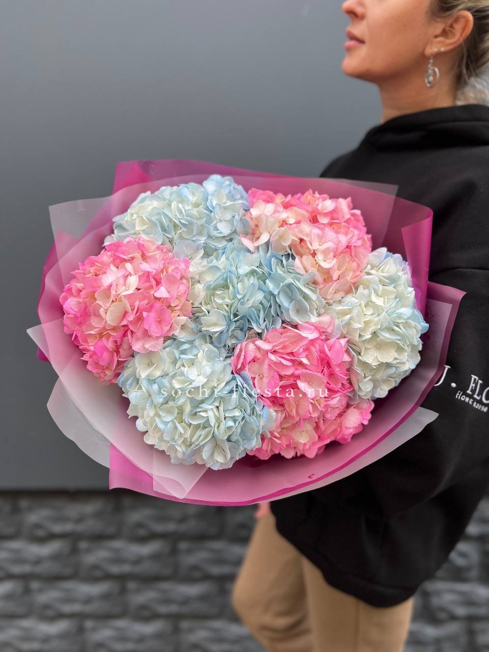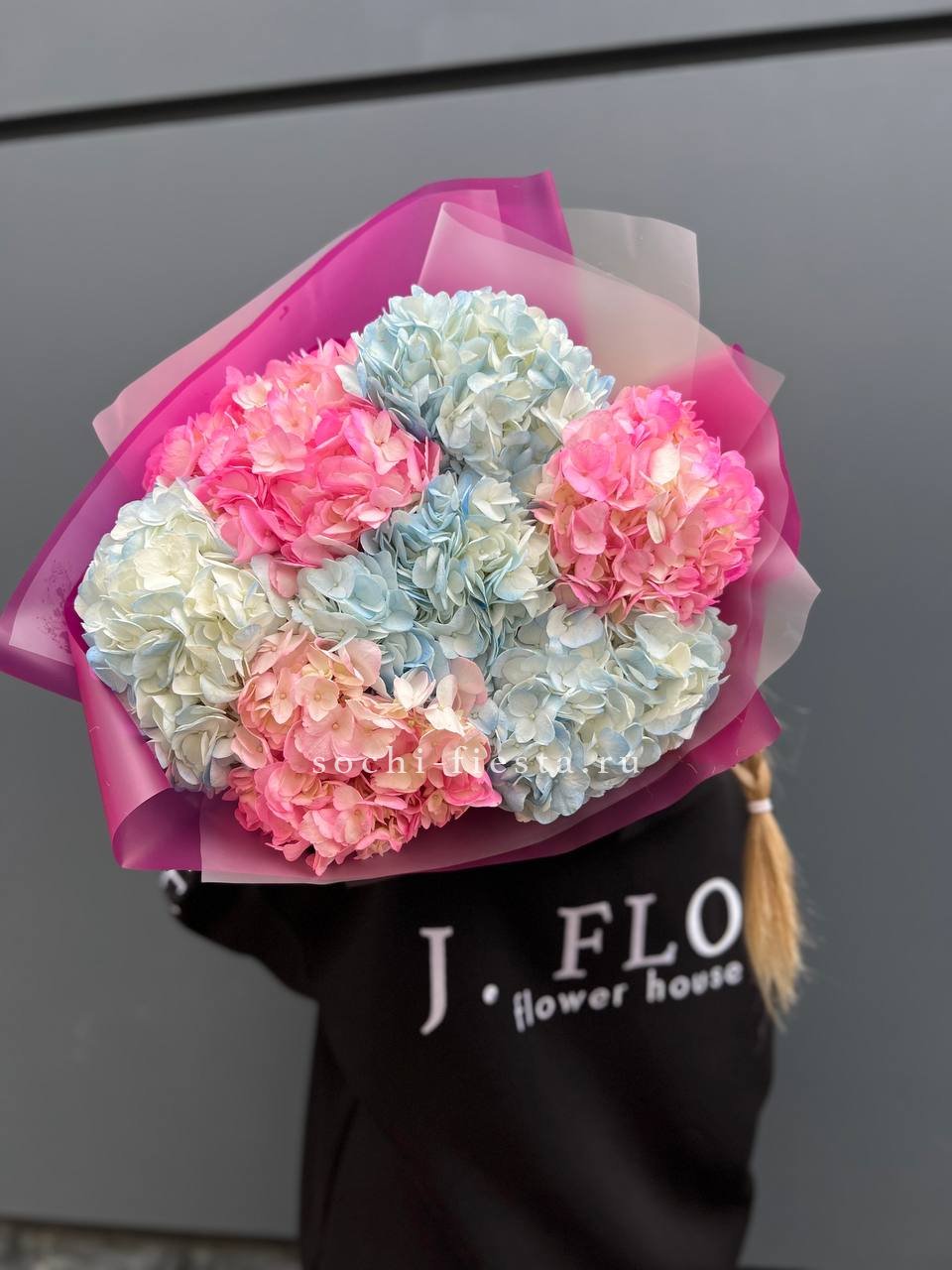 маттиола, розовые розы, гортензии, диантусы, лента и дизайнерская пленка.