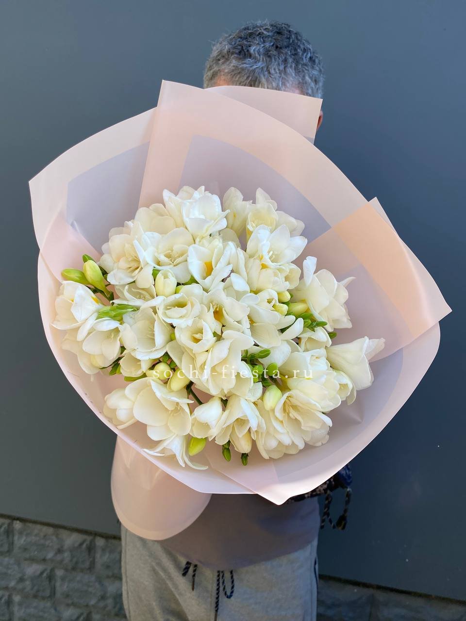 Состав: 25 белых фрезий, оформление, лента