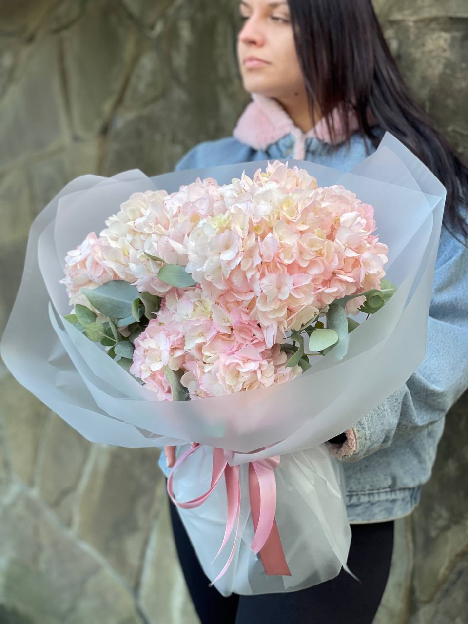 Три крупных соцветия гортензии образуют лаконичную композицию. Букет уверенно держит форму и легко вписывается в любое пространство.