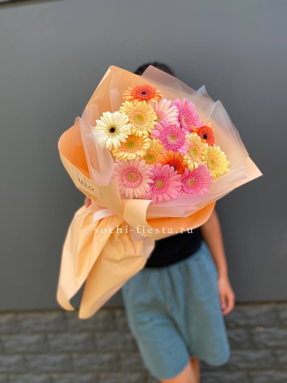 Пятнадцать гербер собраны в плотную округлую форму, где каждый цветок раскрыт навстречу свету. Яркая палитра создаёт ощущение летнего дня, застывшего в лепестках.