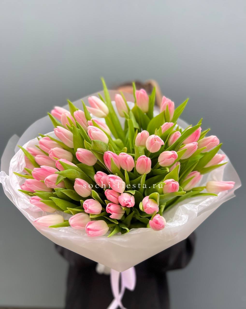 Пышная охапка из полусотни тюльпанов создает объемное облако цвета. Бутоны собраны плотно, образуя живую скульптуру с мягким розовым свечением. Такая композиция меняет восприятие пространства вокруг.
