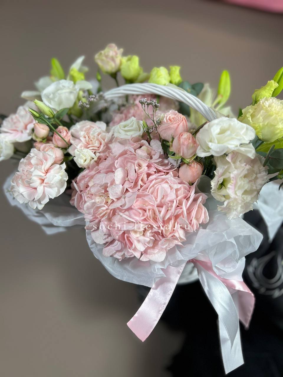 гортензия, бомбастик, диантус, лимониум, лилия, эустома. эвкалипт, корзина малая.