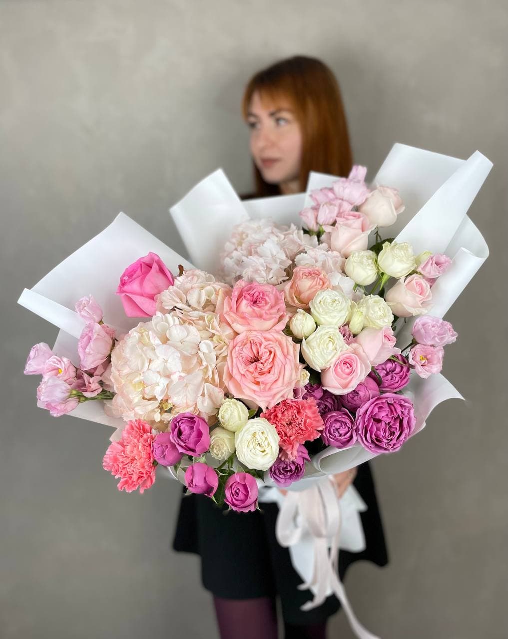 Пышная гортензия задает объем, а французские розы и эустома создают многослойную глубину. Диантусы добавляют графичные точки, эвкалипт обрамляет композицию мягкими линиями.