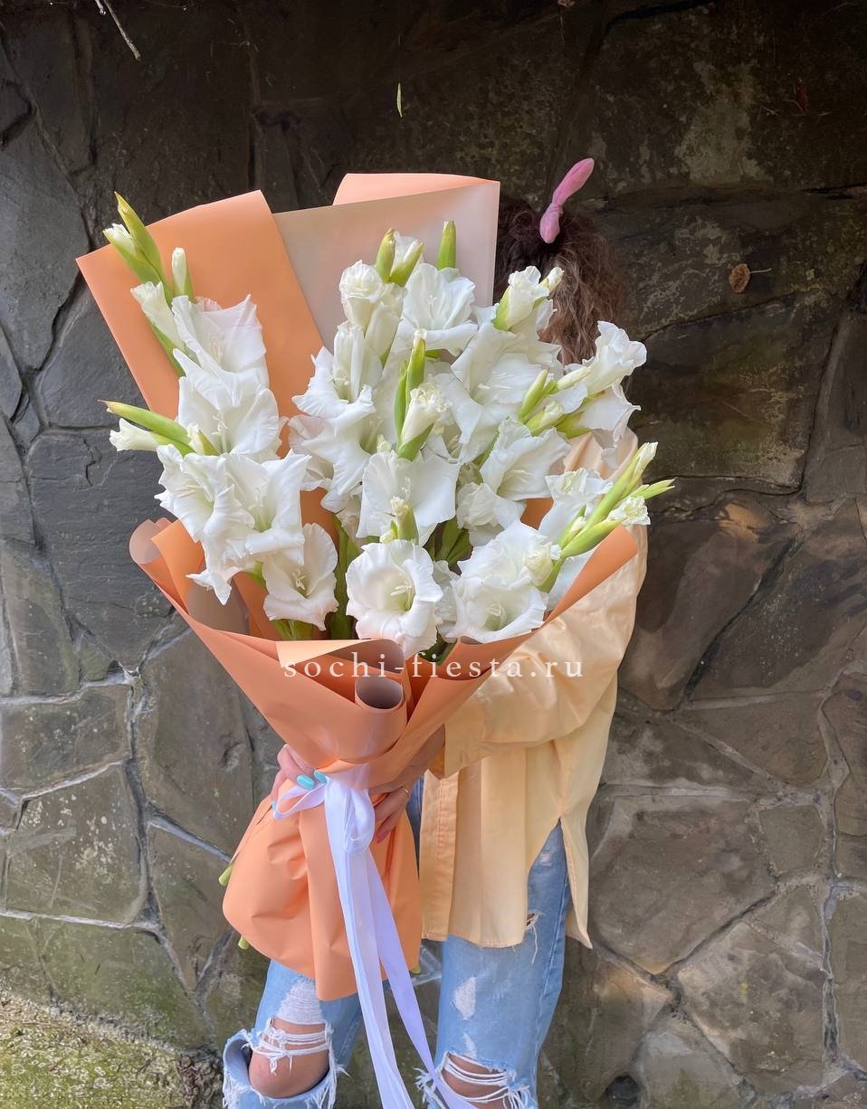 белые гладиолусы - 9 шт., лента, корейская пленка.
