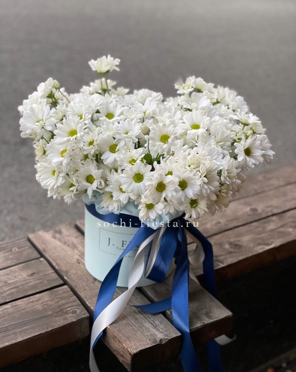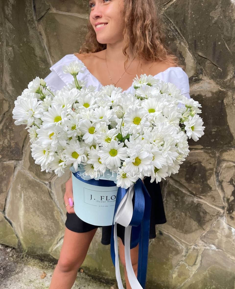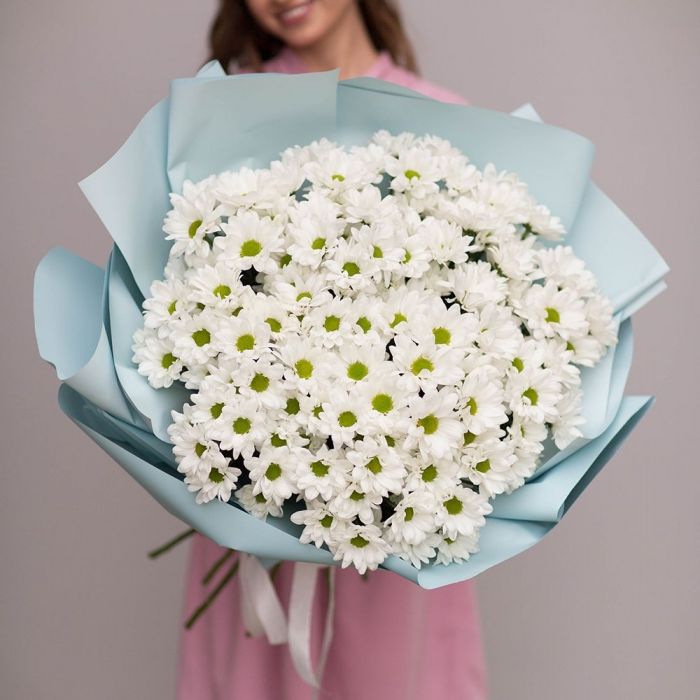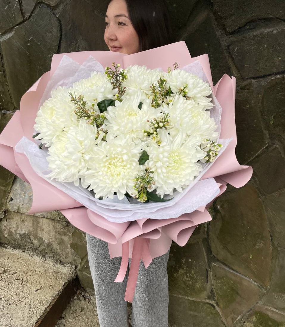 хризантема одноголовая - 9 шт., хамелациум, 5-7 шт., лента, дизайнерская упаковка.