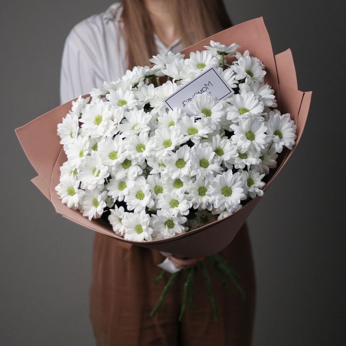 Семь крупных хризантем с открытыми бутонами в дизайнерской упаковке. Букет выглядит свежо и современно, легко вписывается в любое пространство.