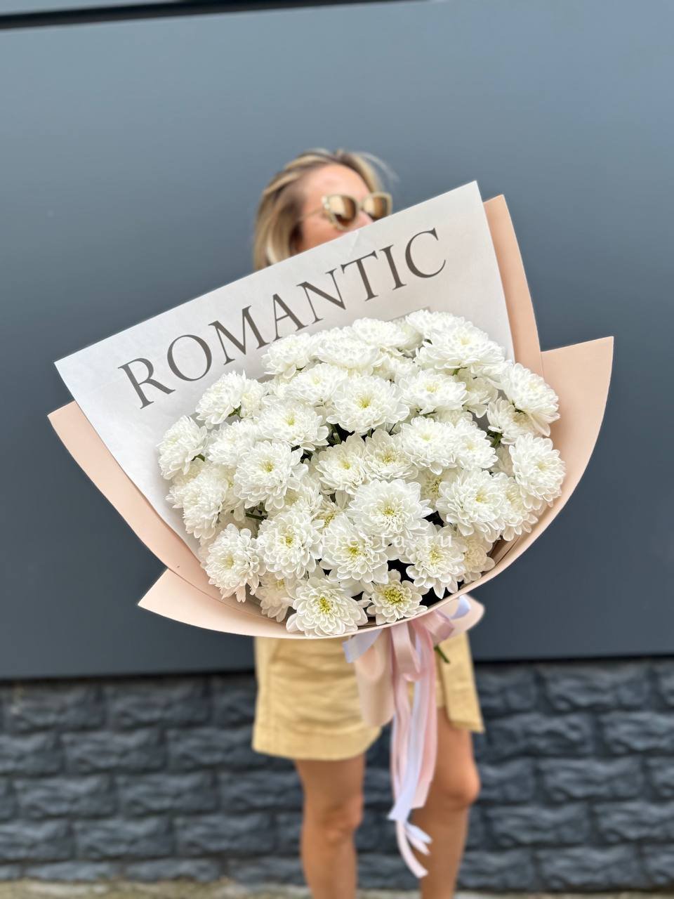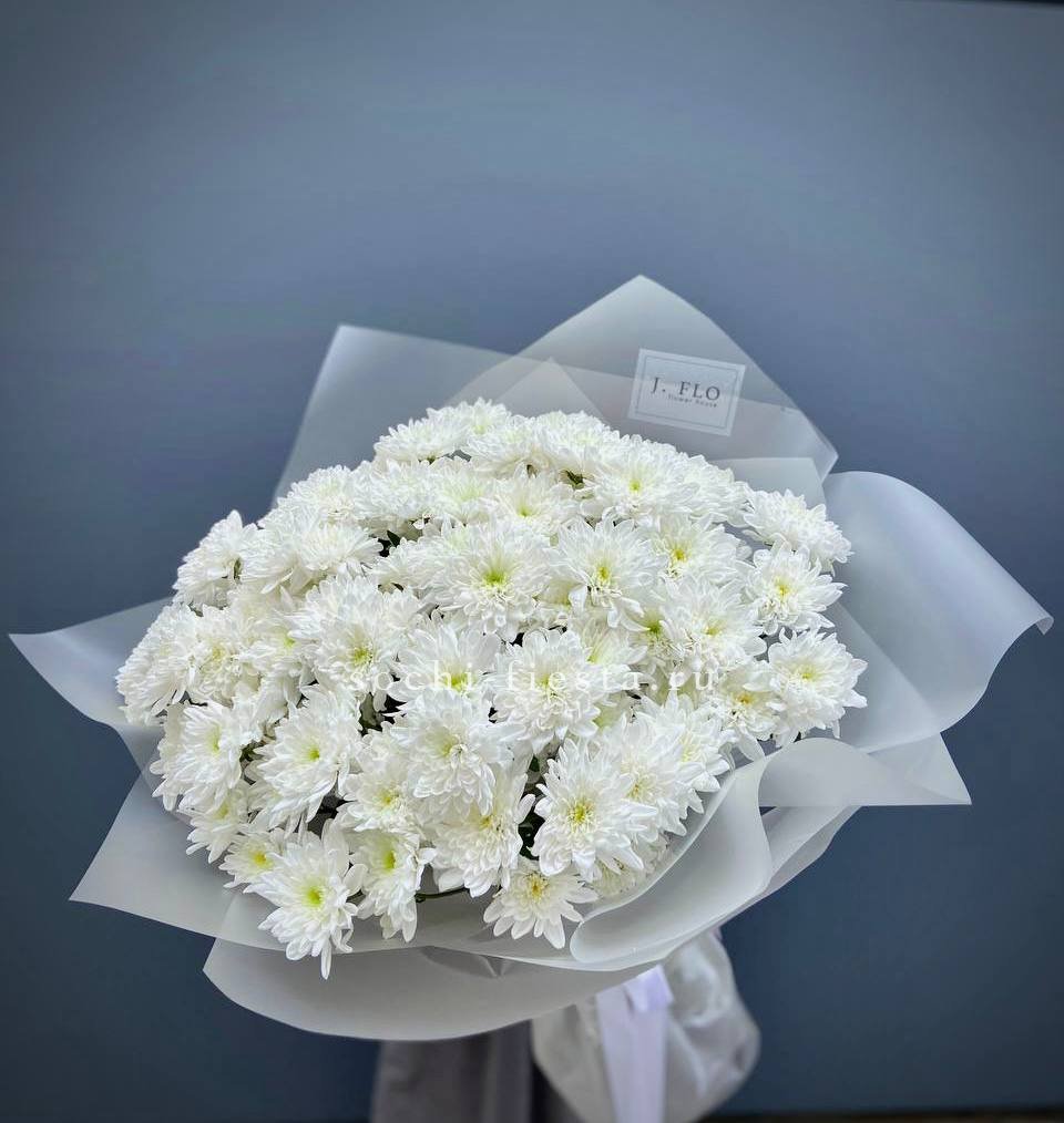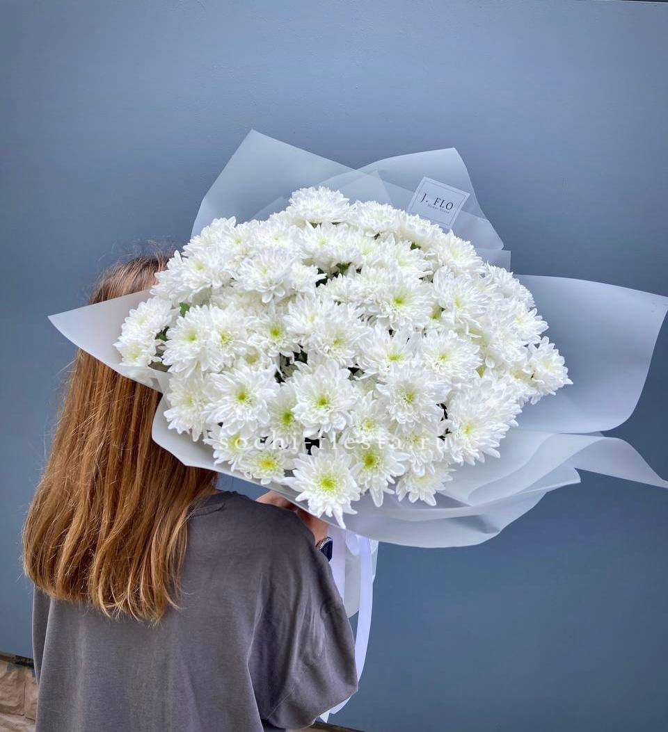 Крупные соцветия одноголовых хризантем раскрываются во всей полноте. Плотные лепестки образуют графичные круги, а сдержанная упаковка сохраняет чистоту формы.