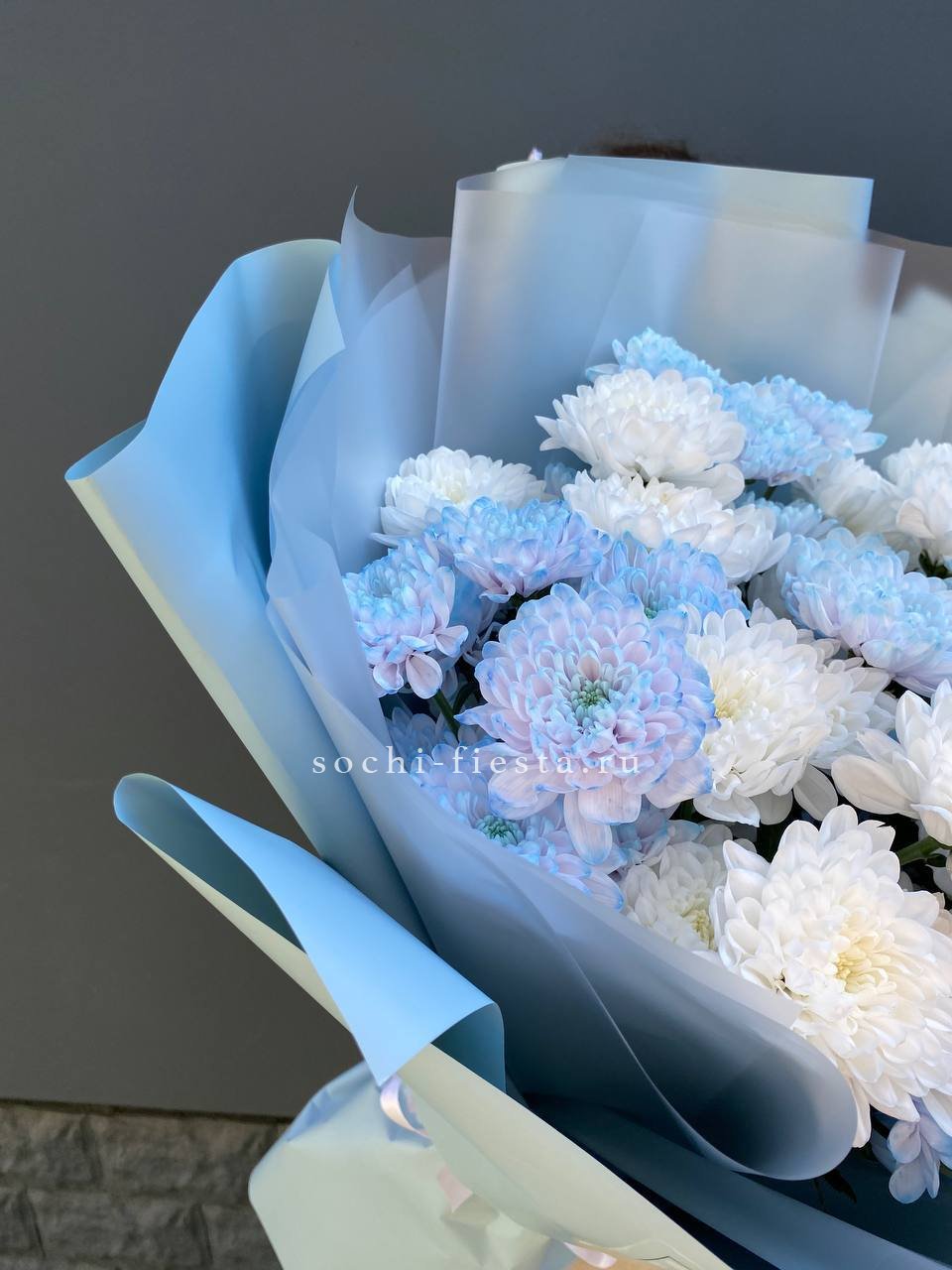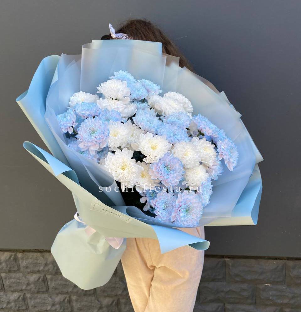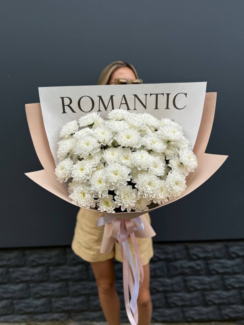 Крупные соцветия одноголовых хризантем раскрываются во всей полноте. Плотные лепестки образуют графичные круги, а сдержанная упаковка сохраняет чистоту формы.