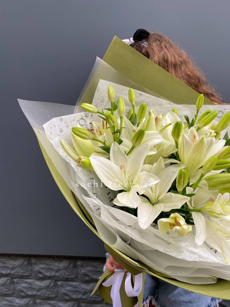 5 лилий, хамелациум или гипсофила, лента, упаковка, лента.