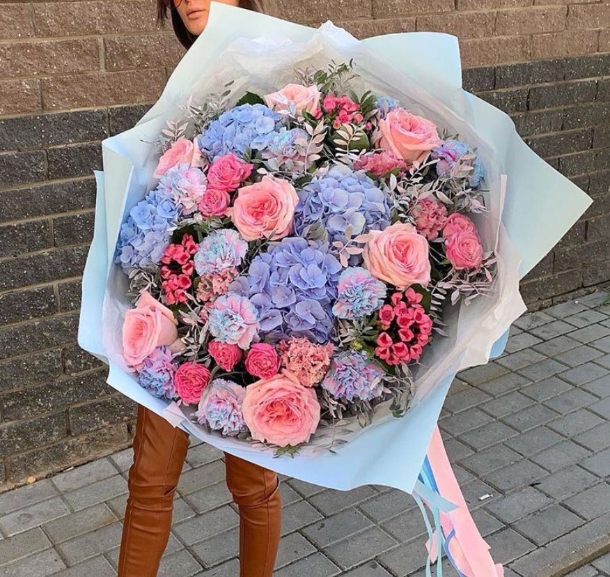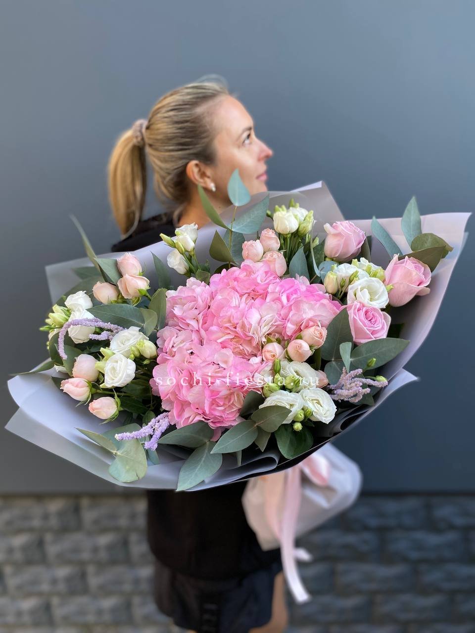 гортензия, диантус, кустовая пионовидная роза, эустома, орхидеи (или аналог), эвкалипт, лента, дизайнерская упаковка.