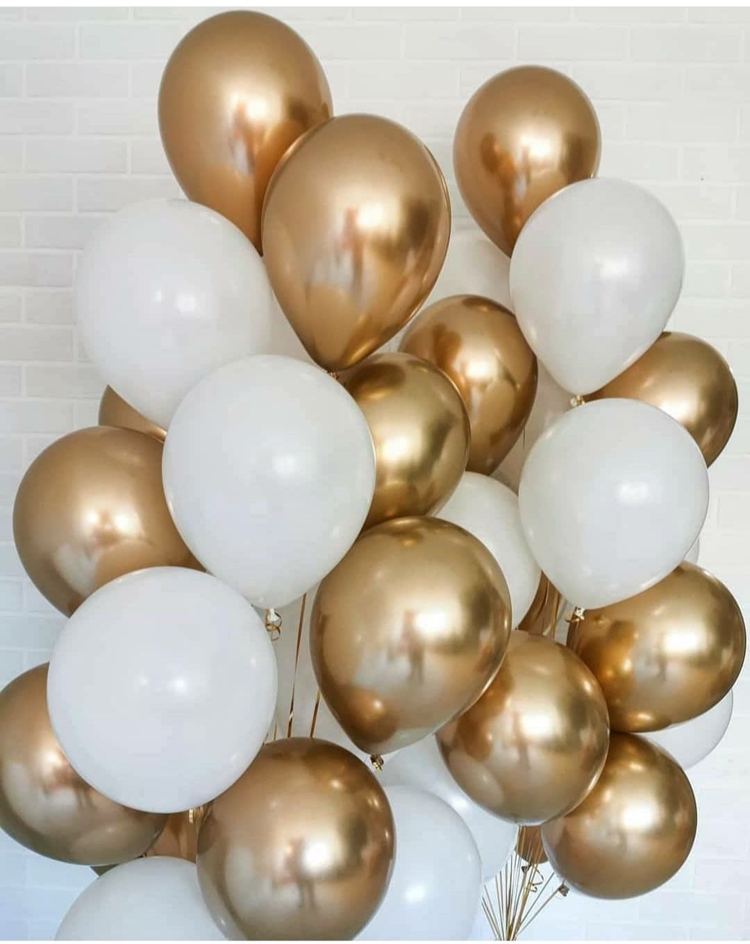 Два фонтана взмывают вверх разными фактурами: глянец хрома, мягкость матовых оттенков, мерцание конфетти внутри прозрачных сфер. Розовый и белый переплетаются в воздушную инсталляцию с фольгированными звёздами на вершине.