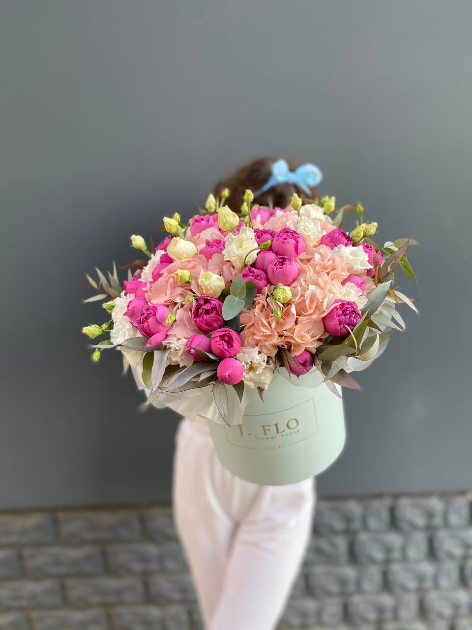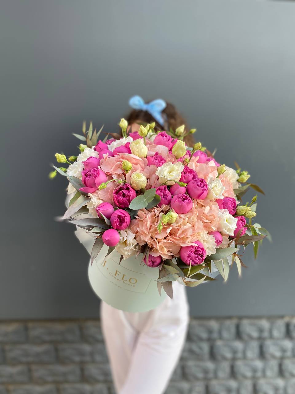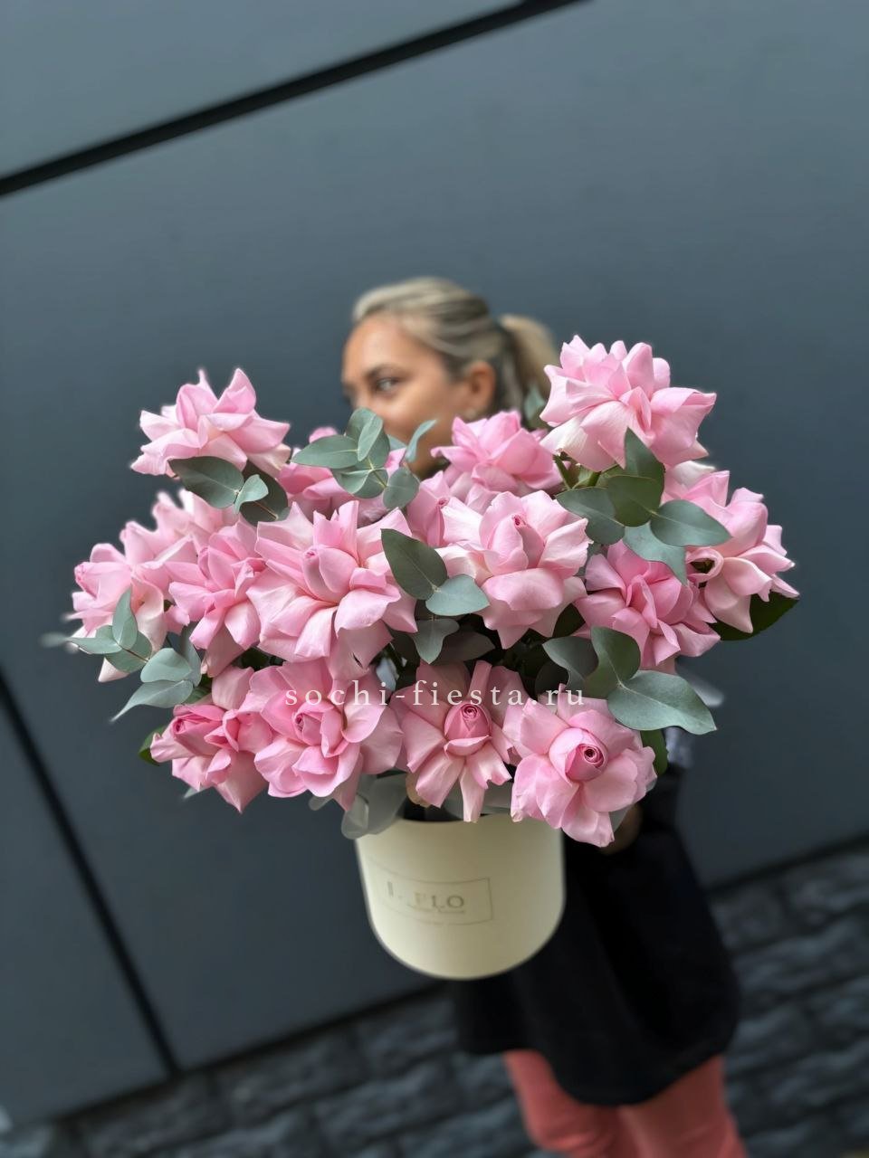 гортензия, вывернутые розы, диантус, кустовая роза, эустома, бокс D20, тишью.