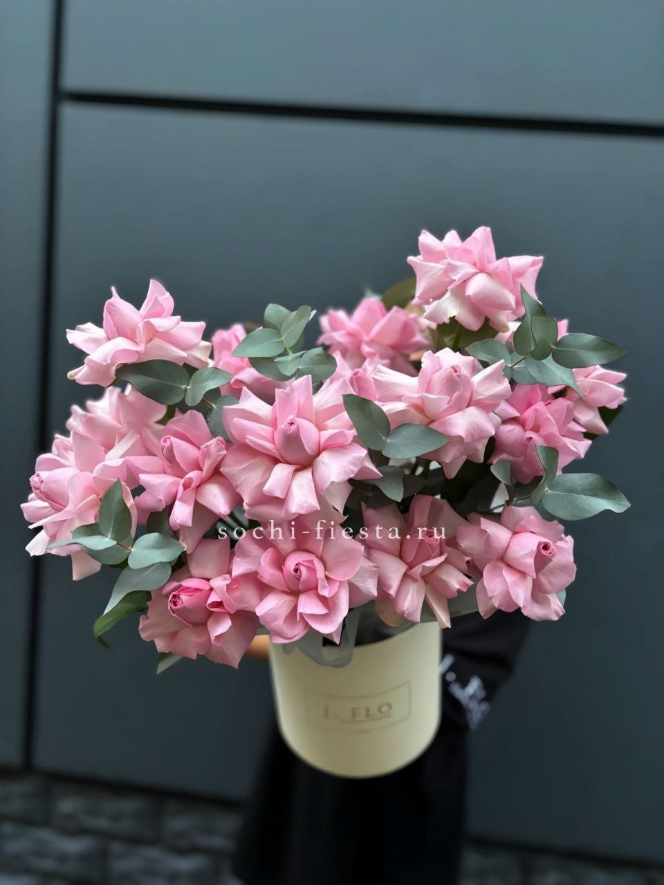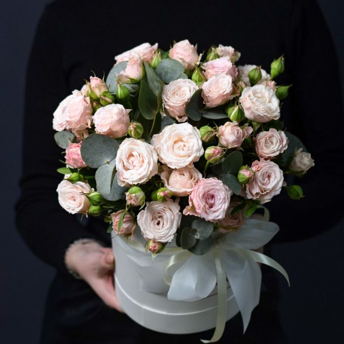 Вывернутые лепестки роз открывают внутреннюю текстуру бутонов и добавляют объема композиции. Гортензия и эустома заполняют пространство между крупными головками и создают многослойность.