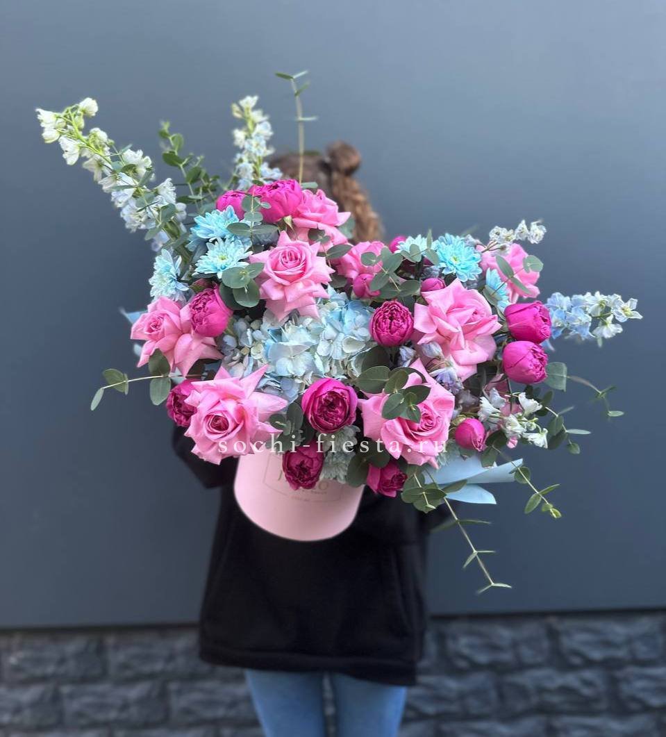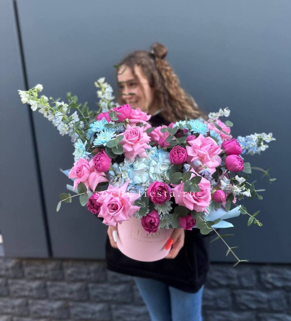 Розы, герберы и пышные соцветия гортензии в розово-голубой гамме наполняют бокс свежестью и легкостью. Каждый цветок раскрывается по-своему, создавая многослойную композицию. Готовое решение для яркого момента.