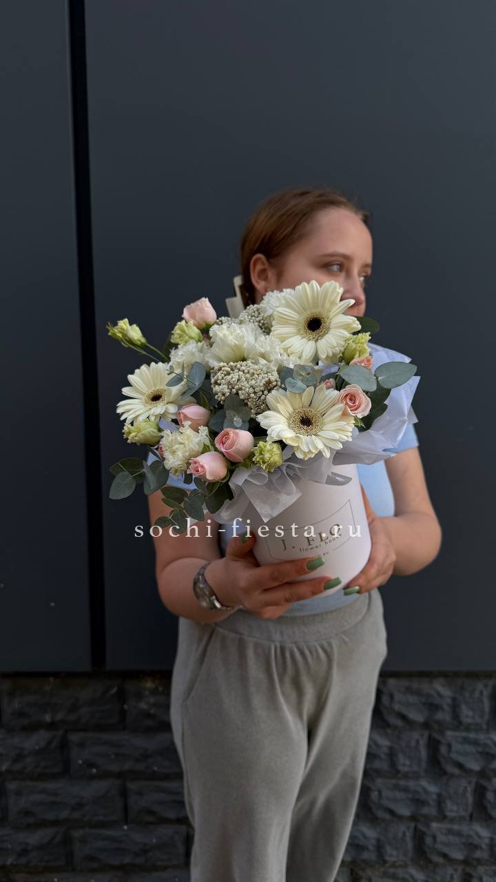 Яркие герберы и кустовые розы собраны в плотную круглую форму. Эустома добавляет воздушности, а озотамус создает текстурный контраст между крупными бутонами. Композиция держит форму и выглядит празднично.