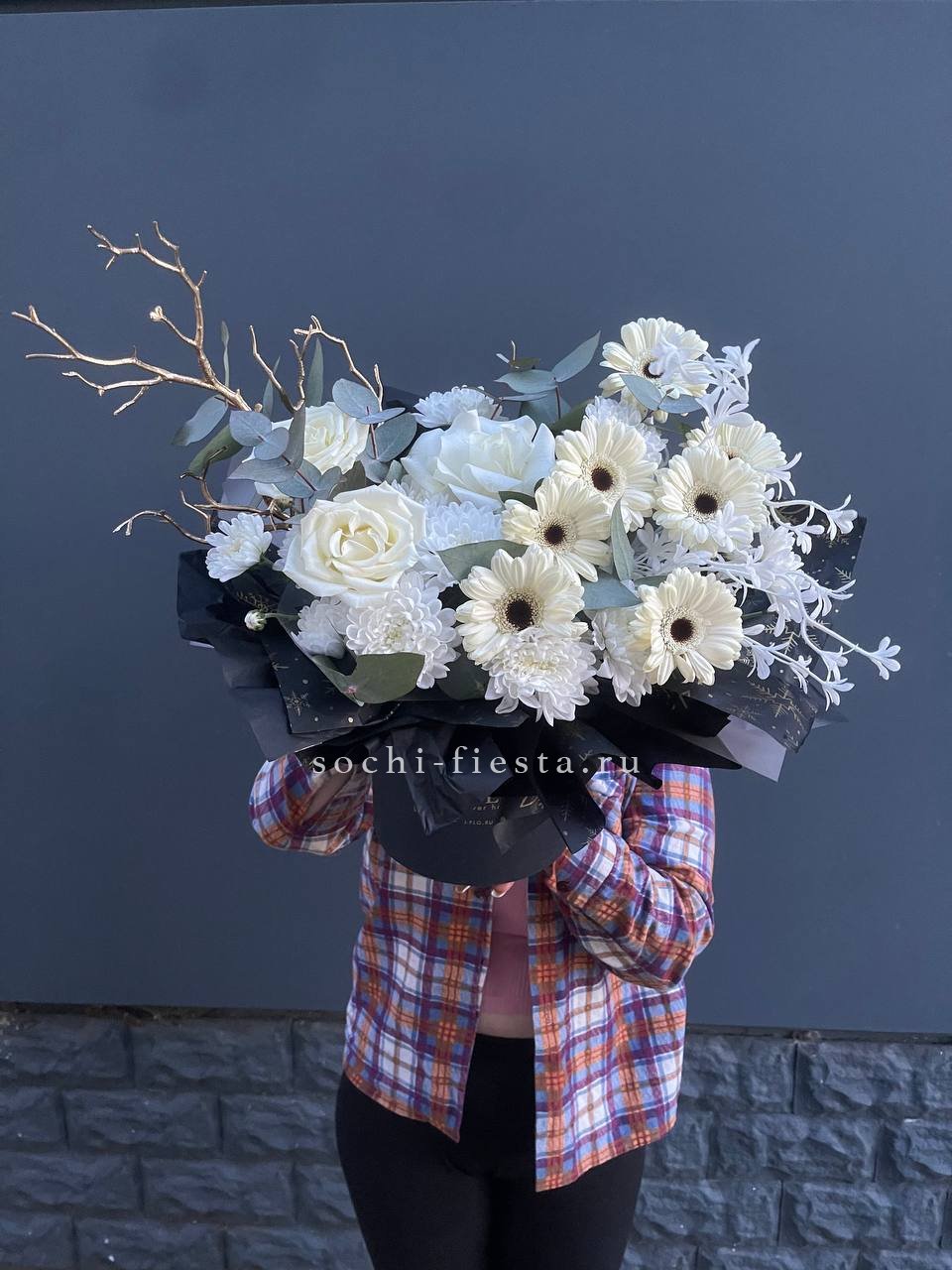 Герберы и хризантемы собраны в плотную шапку с белыми розами по краю. Композиция держит форму и выглядит графично благодаря чередованию крупных и мелких соцветий.