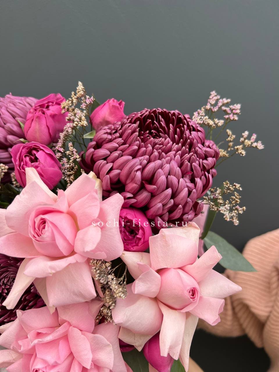 Хризантемы и диантусы задают воздушную текстуру, а мисти бабблс добавляет композиции объем. Лимониум вплетается между бутонами, создавая мягкую игру оттенков.