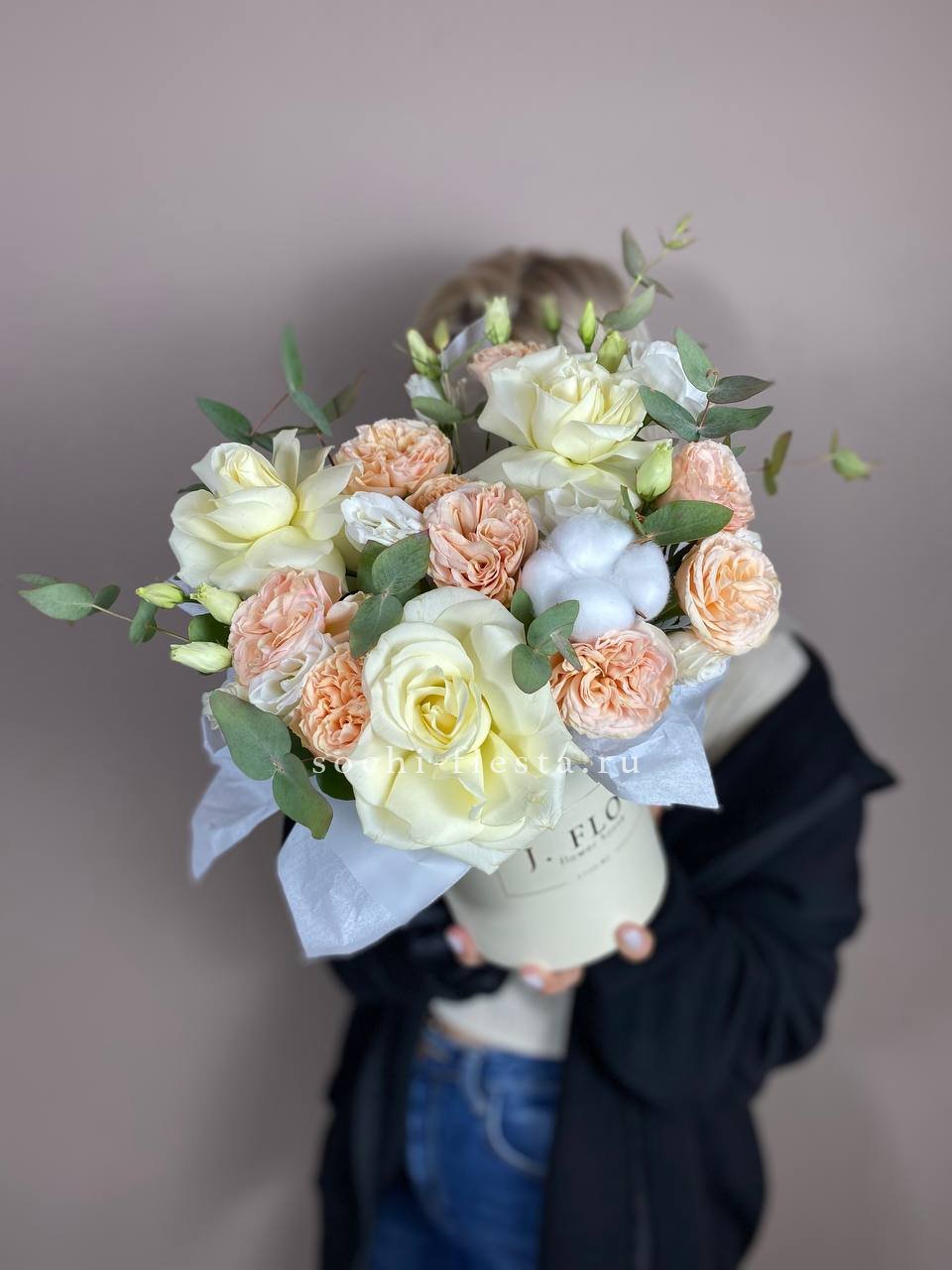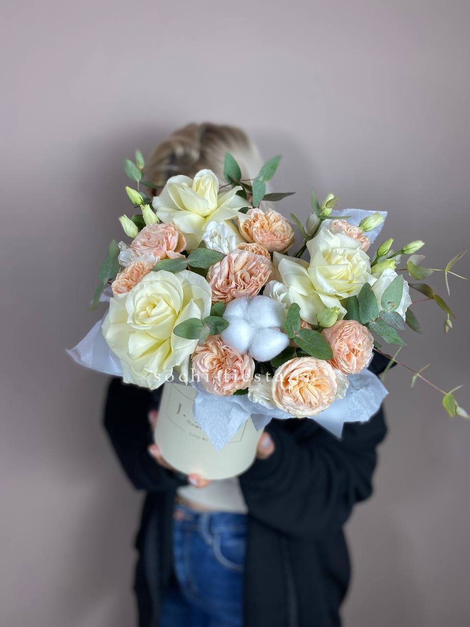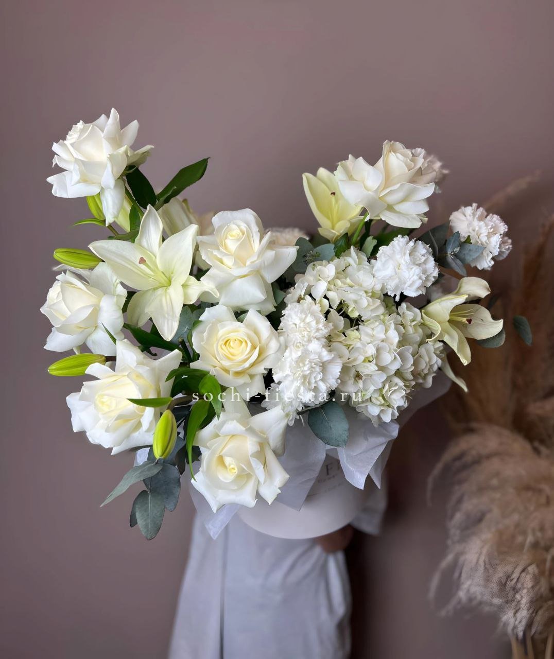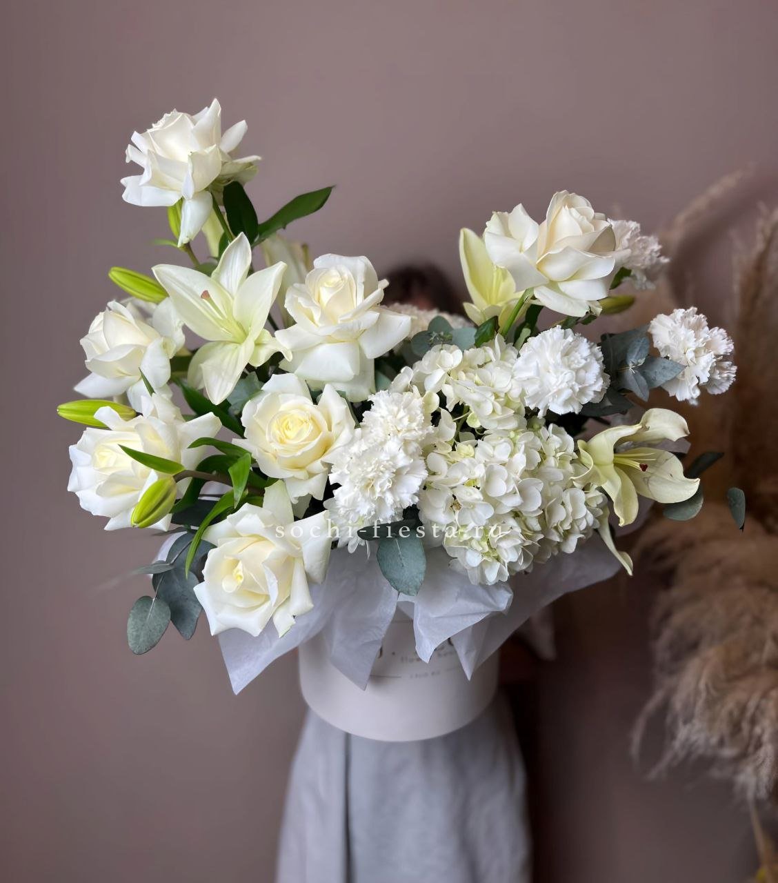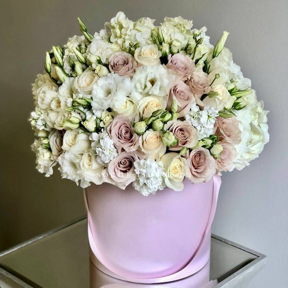 пионовидная кустовая роза, гортензия, одноголовая роза, эустома, бавардия, бокс D20.