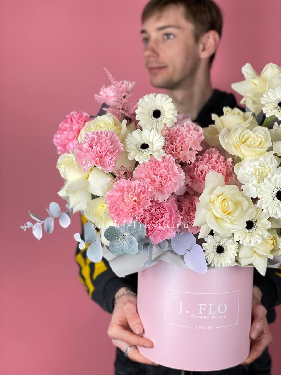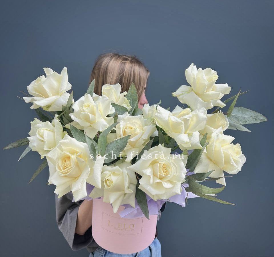 Белоснежные розы и герберы выстраивают чистую цветовую гамму с яркими акцентами диантусов. Эвкалипт вносит графичность и природную фактуру в общую композицию.