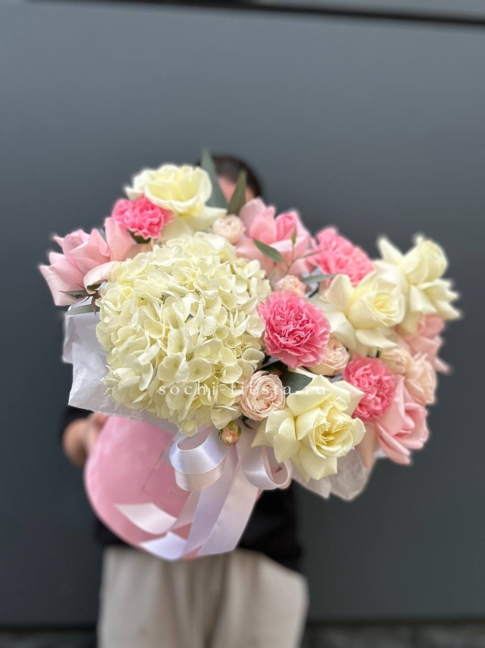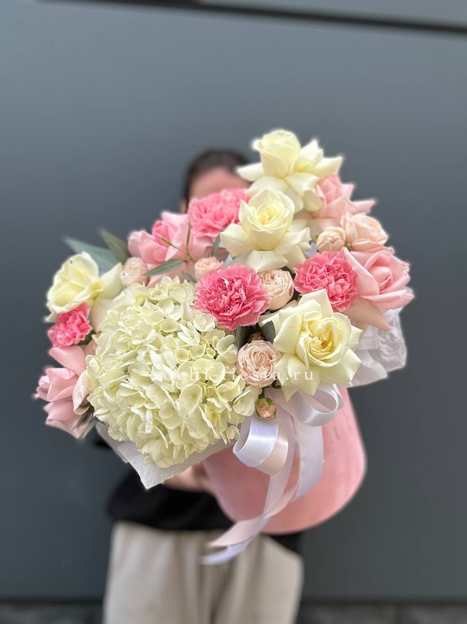 Пионовидные кустовые розы формируют плотный купол с мягкими переходами оттенков. Каждый бутон раскрывается слоями, создавая объёмную текстуру. Эвкалипт добавляет свежести композиции в цилиндре.