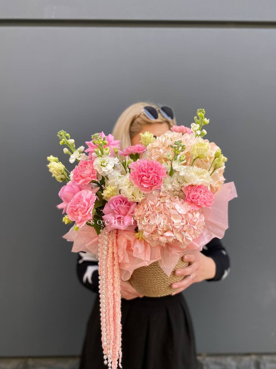 Мягкая палитра белых оттенков с вкраплениями диантуса создает воздушную композицию в натуральном джутовом кашпо. Кустовые розы добавляют объем, а эвкалипт завершает природную гармонию. Готовое решение для интерьера в спокойных тонах.