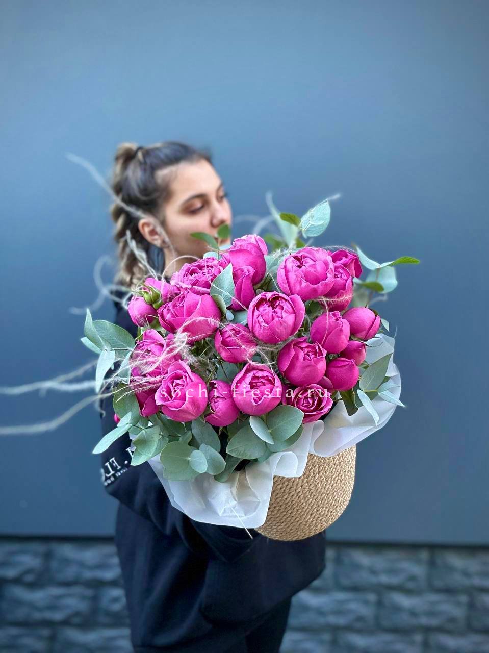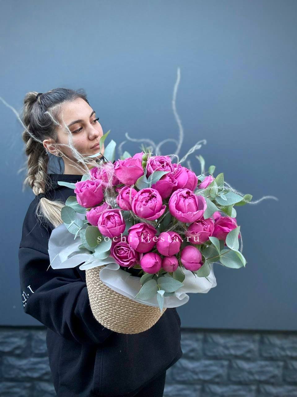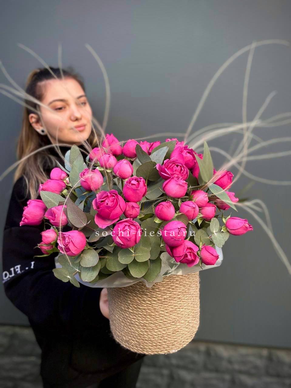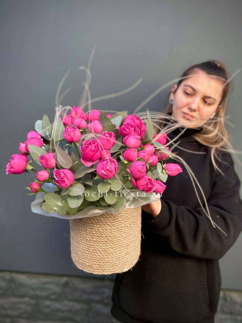 розовые розы, пионовидные кустовые, эустома, ранункулюс (возможна замена в зависимости от сезонности) в джутовом кашпо с элементами бус и перьев.