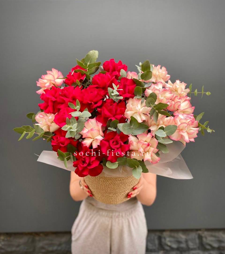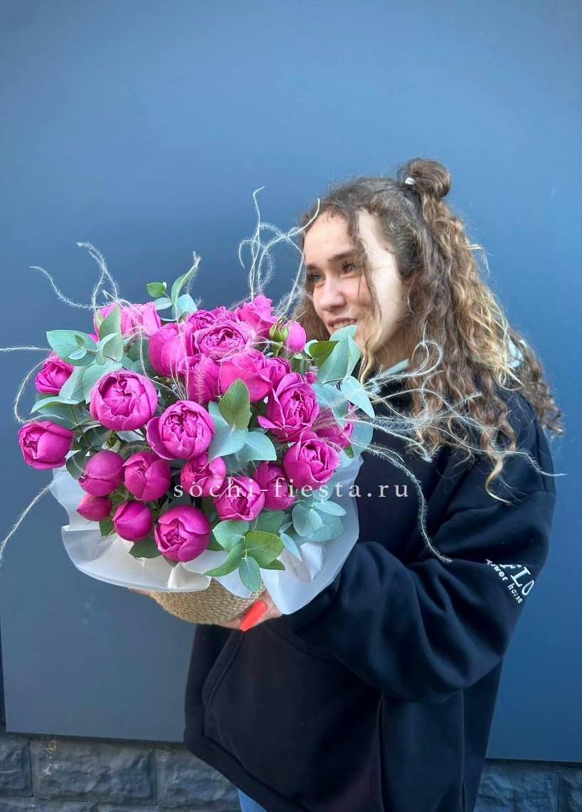 Пионовидные розы в джутовом кашпо