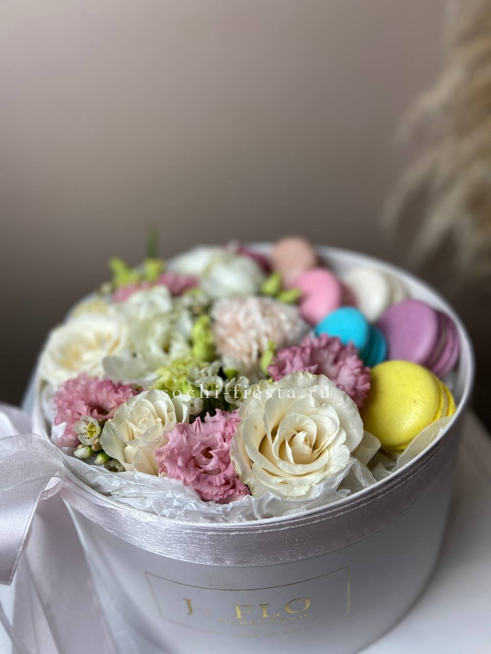 пионовидные розы Мисти Баблс, эустома круглая коробка D20, 6 макаронс.