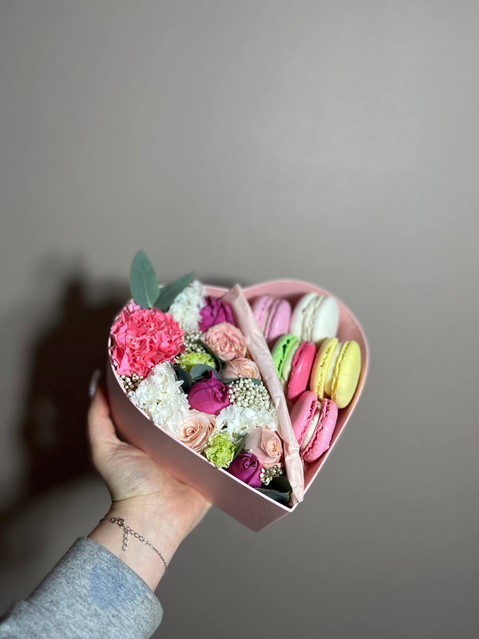 Белые розы в круглом боксе дополнены яркими альстромериями и шестью воздушными макаронс. Композиция собрана плотно и выглядит свежо в любом интерьере.