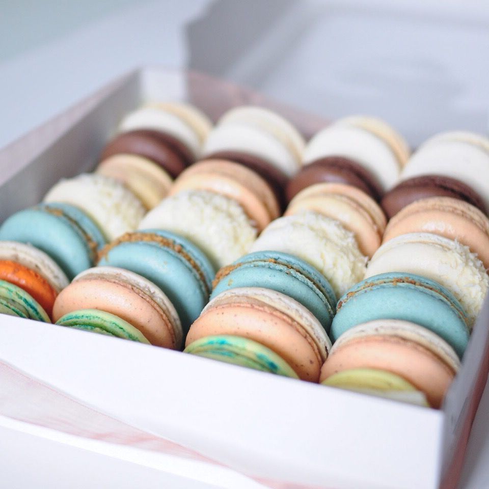 белые розы, альстромерии (по сезону) круглая коробка D20, 6 макаронс.