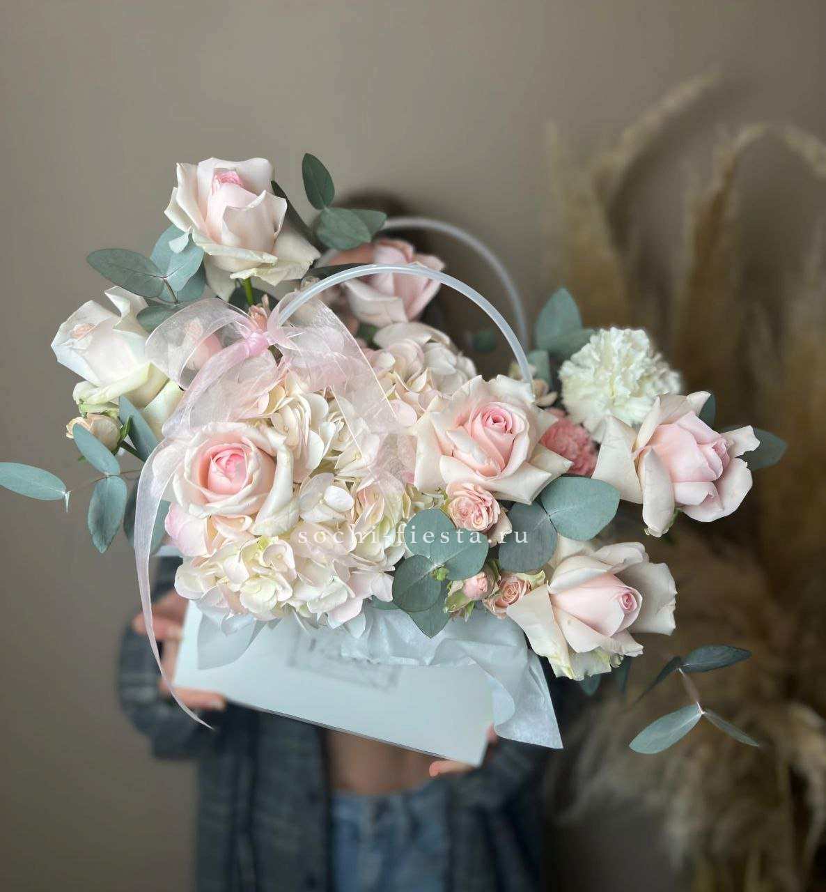 Розовые розы встречаются с орхидеей цимбидиум в объемной сумке-кашпо. Эустома и диантус создают многослойность, а кустовые розы заполняют пространство между крупными бутонами. Композиция держит форму и радует насыщенностью.