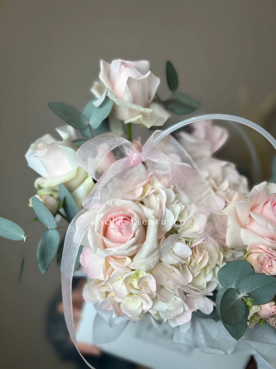розовые розы, эустома, кустовые розы, диантус, орхидея цимбидиум или лилия, лента, сумка-кашпо.