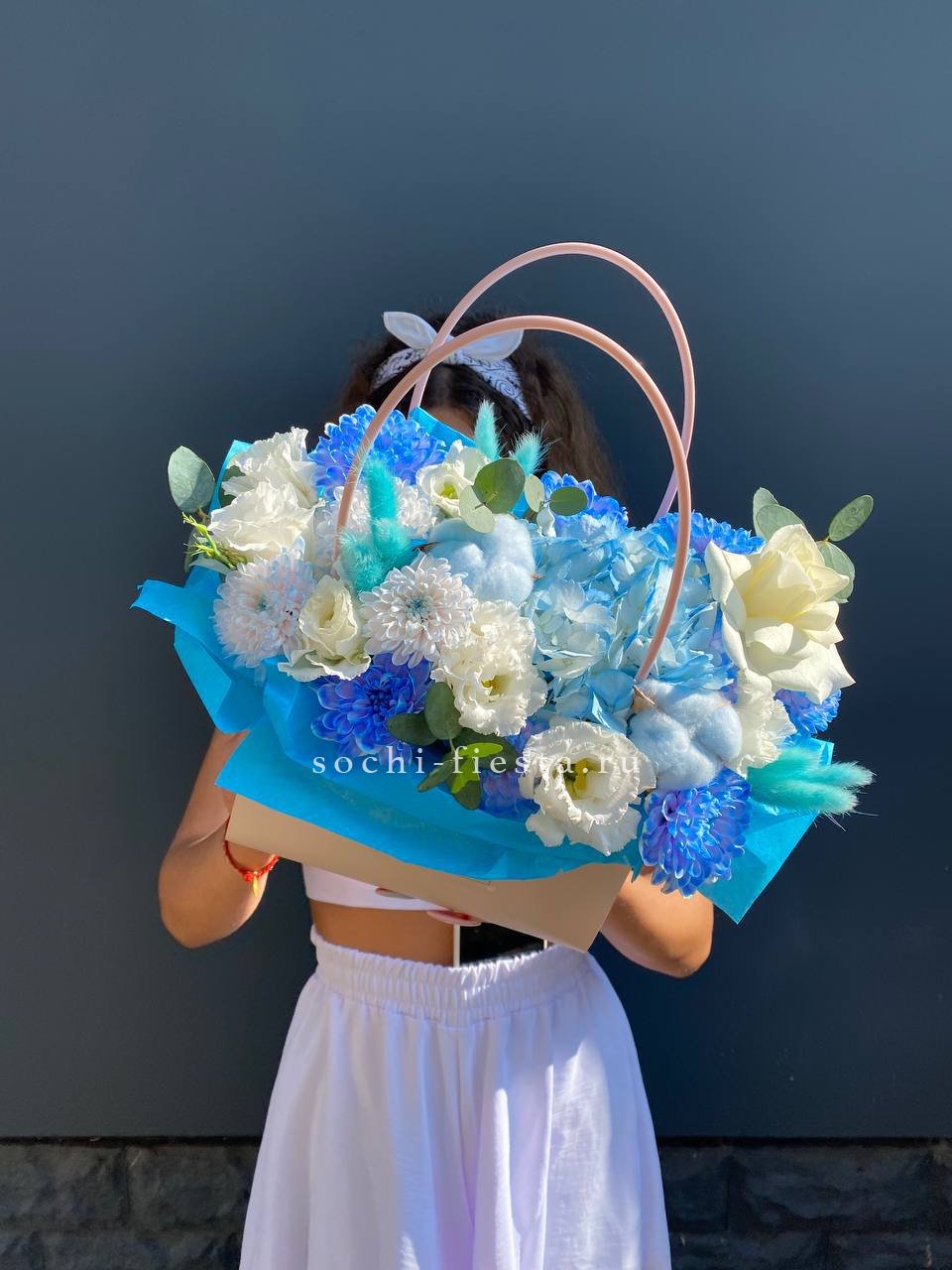 Голубая гортензия задаёт тон всей композиции, где хризантема и эустома создают объём, а хлопок с лагурусом добавляют воздушности. Сумочка вмещает насыщенную палитру без перегруженности.