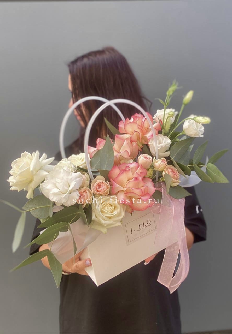 сумочка в белых тонах с лилией, герберой и эвкалиптом.