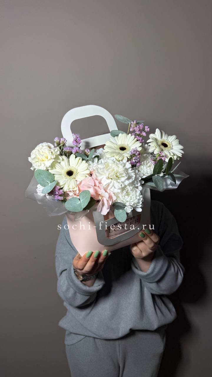 сумочка из лилий и сезонных цветов.