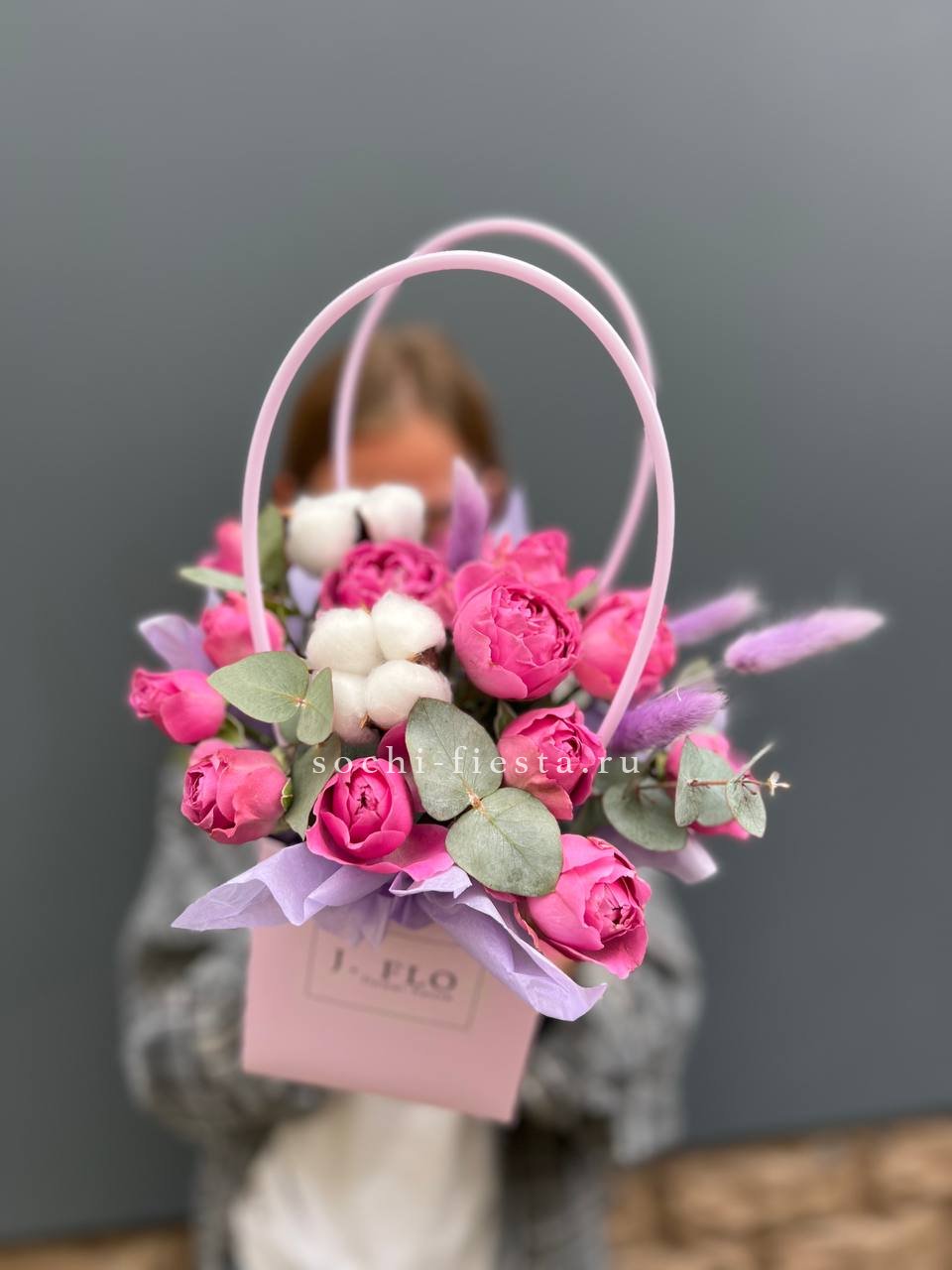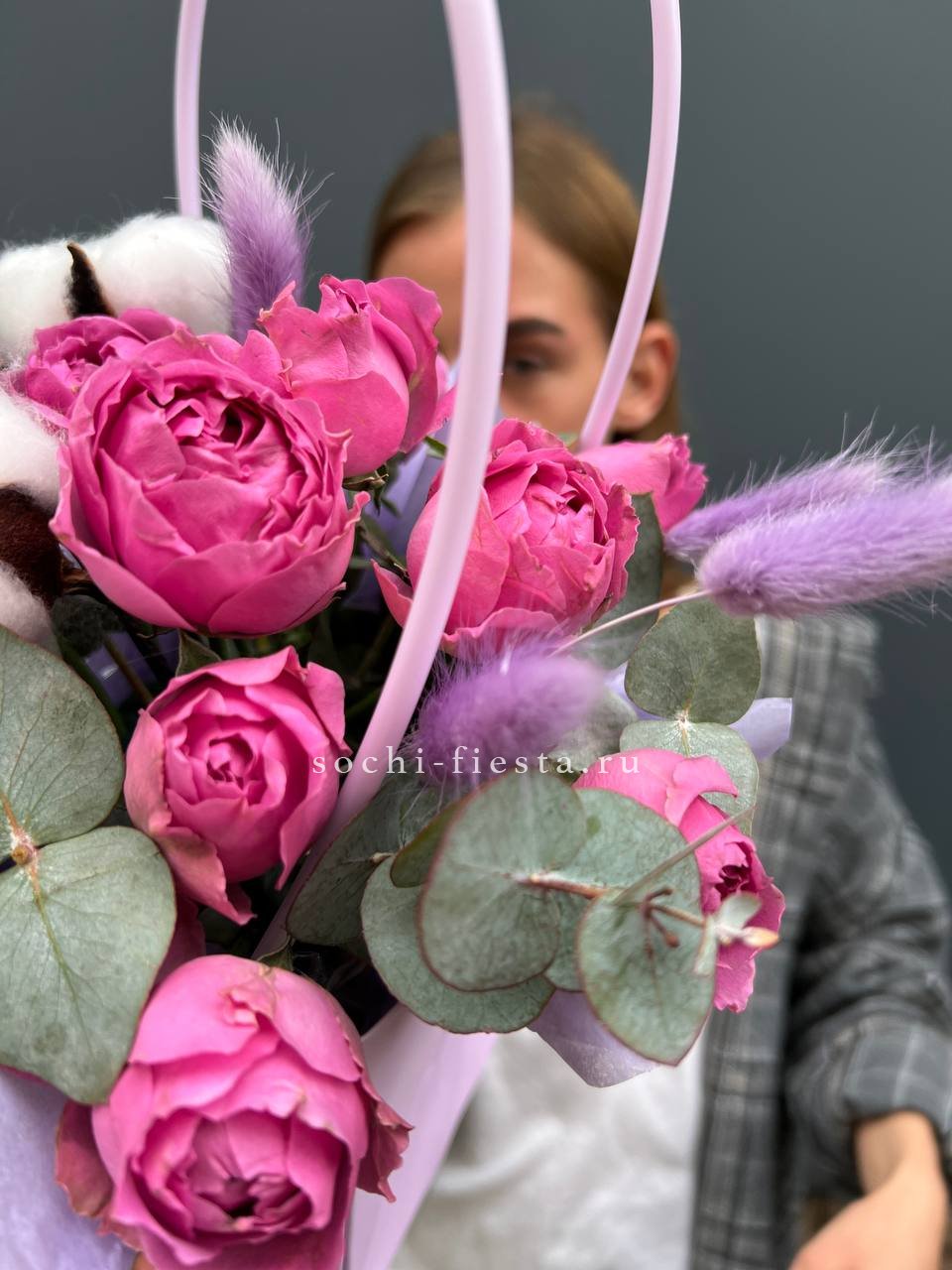 Данная цена доступна при единовременном заказе от 10 шт. Состав: хризантема кустовая, эвкалипт, дантус, сумочка.