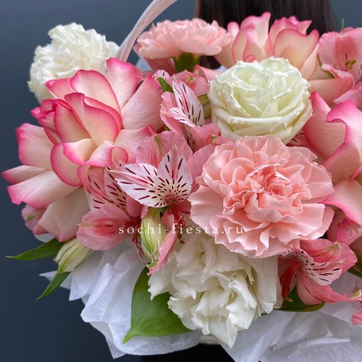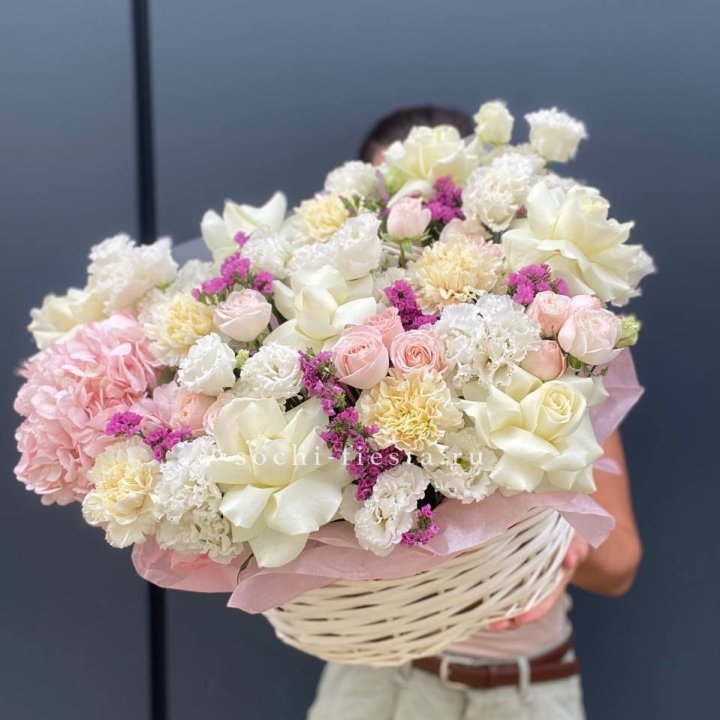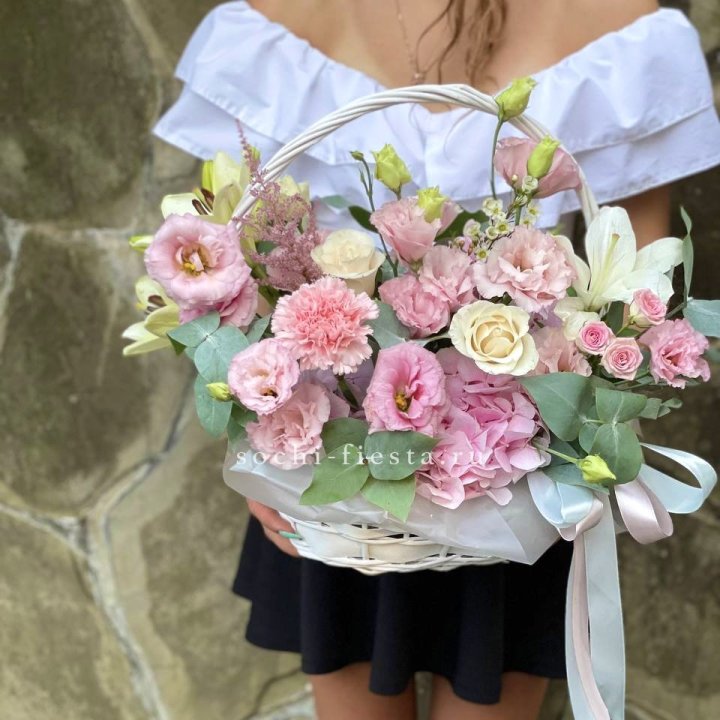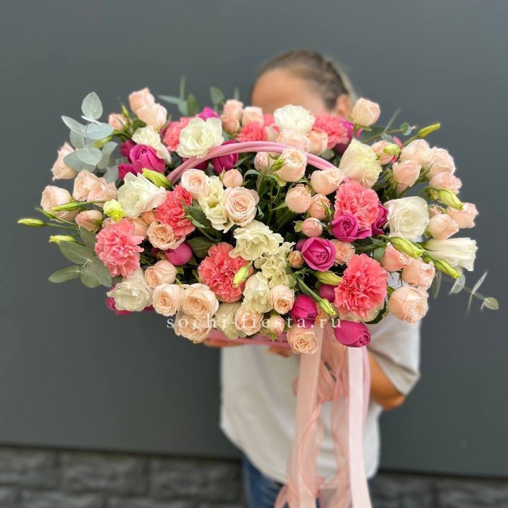 Состав корзин в Энгельсе определяется текущими поставками и сезоном. Розы Freedom, Mondial, Cappuccino — для классических куполообразных аранжировок. Пионы в мае-июне из свежих поставок: Sarah Bernhardt, Red Charm, Bowl of Cream — главный сезонный продукт. Хризантема, альстромерия, гербера — для объёмных торжественных наполнений. Эустома, ранункули — для садовых корзин. Флорист строит состав под конкретный запрос.