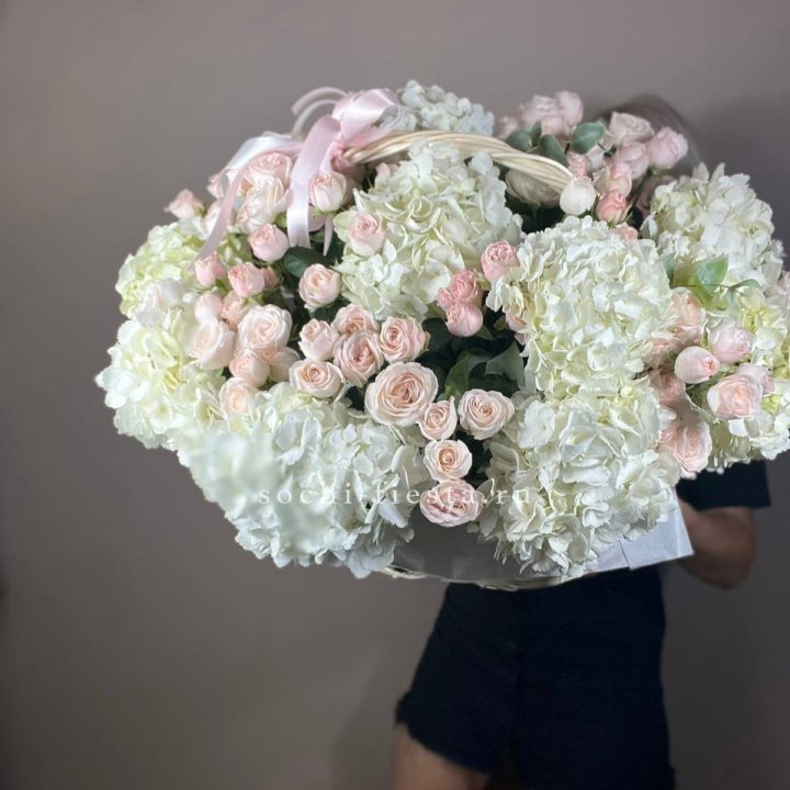 Садовая корзина — главный тренд последних лет. Свободная многовидовая аранжировка в плетёной корзине: эустома, ранункули, нигелла, зелень — ощущение только что срезанных цветов из загородного сада. Покупают те, кто устал от строгих классических форматов и ищет природной органики и лёгкости в подарке.