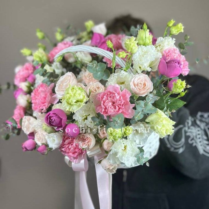 Состав корзин в Энгельсе определяется текущими поставками и сезоном. Розы Freedom, Mondial, Cappuccino — для классических куполообразных аранжировок. Пионы в мае-июне из свежих поставок: Sarah Bernhardt, Red Charm, Bowl of Cream — главный сезонный продукт. Хризантема, альстромерия, гербера — для объёмных торжественных наполнений. Эустома, ранункули — для садовых корзин. Флорист строит состав под конкретный запрос.