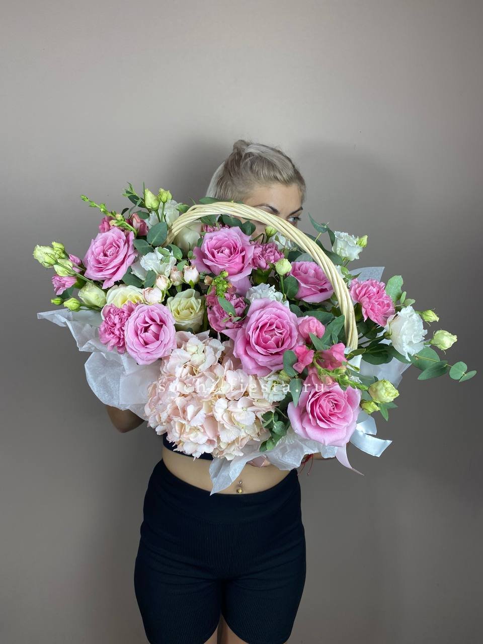 цветочная корзина с розами, мисти баблс, диантусами и гортензией.
