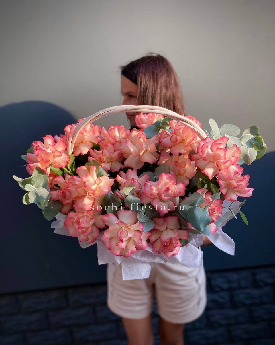 Двадцать пять французских роз в корзине создают плавный переход от светлых розовых тонов к насыщенной фуксии. Эвкалипт добавляет свежести и завершает композицию естественной зеленью. Букет удобно разместить на столе или комоде благодаря устойчивой корзине.