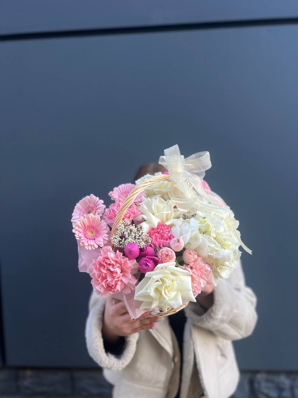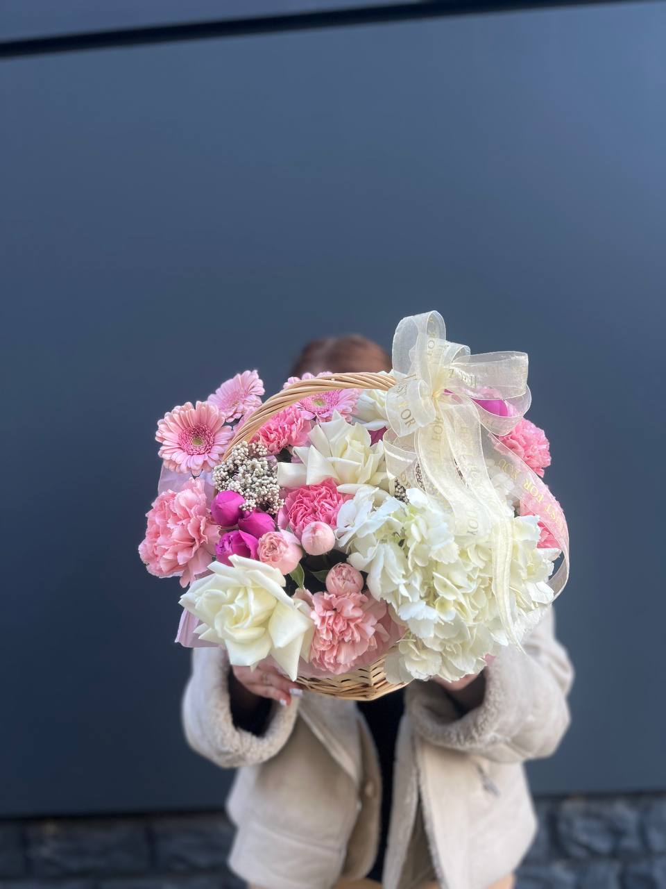 герберы, рзовая роза, диантус, озотамус, мисти баблс, бомбастиу, корзина малая.