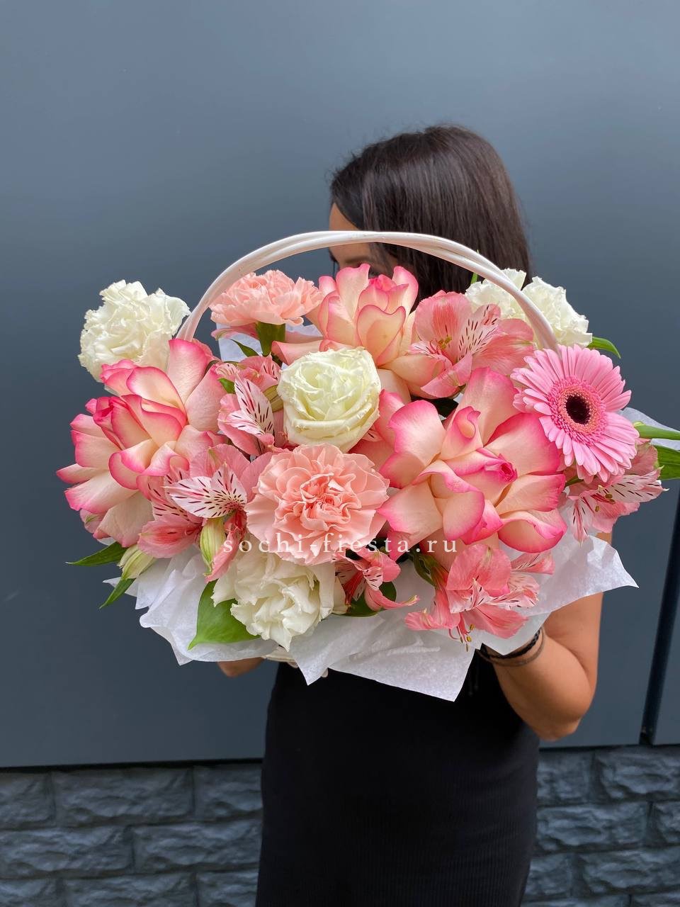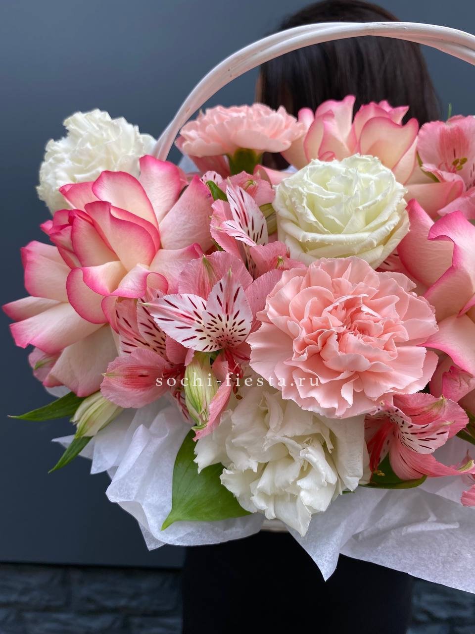 роза одноголовая, эустома, гортензия, мисти баблс, диантус, декоративная зелень, корзина D20. Итоговая корзинка может иметь композиционные отличия в зависимости от сезонности компонентов. При этом внешний вид, объем, цена компонентов, а также цветовая гамма композиции будут соответствовать оригиналу.