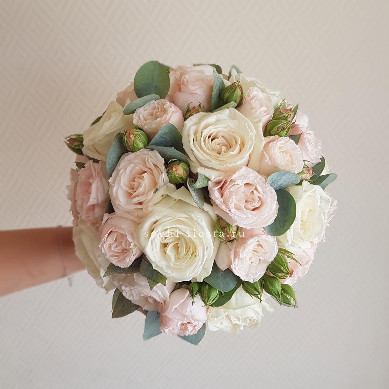 Девятнадцать бутонов эустомы раскрываются слоями воздушных лепестков создавая мягкую текстурную глубину. Эвкалипт добавляет свежести этому монохромному свадебному решению.