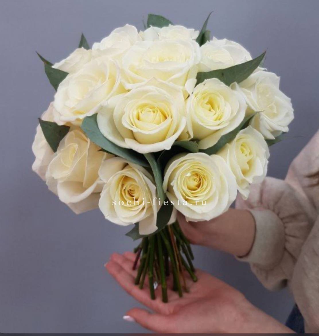 Белая эустома распускается постепенно меняя плотность от закрытых центров к волнистым краям. Веточки эвкалипта создают прохладный зеленый фон для девятнадцати цветков.